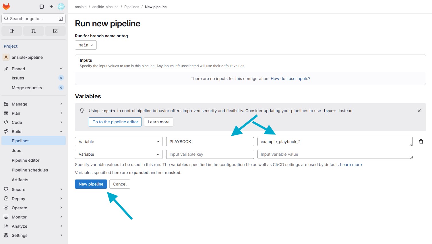 Go to: “Build” > “Pipelines” > “New pipeline”