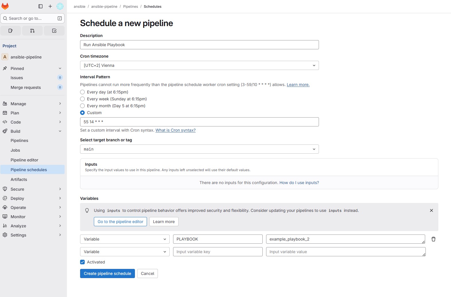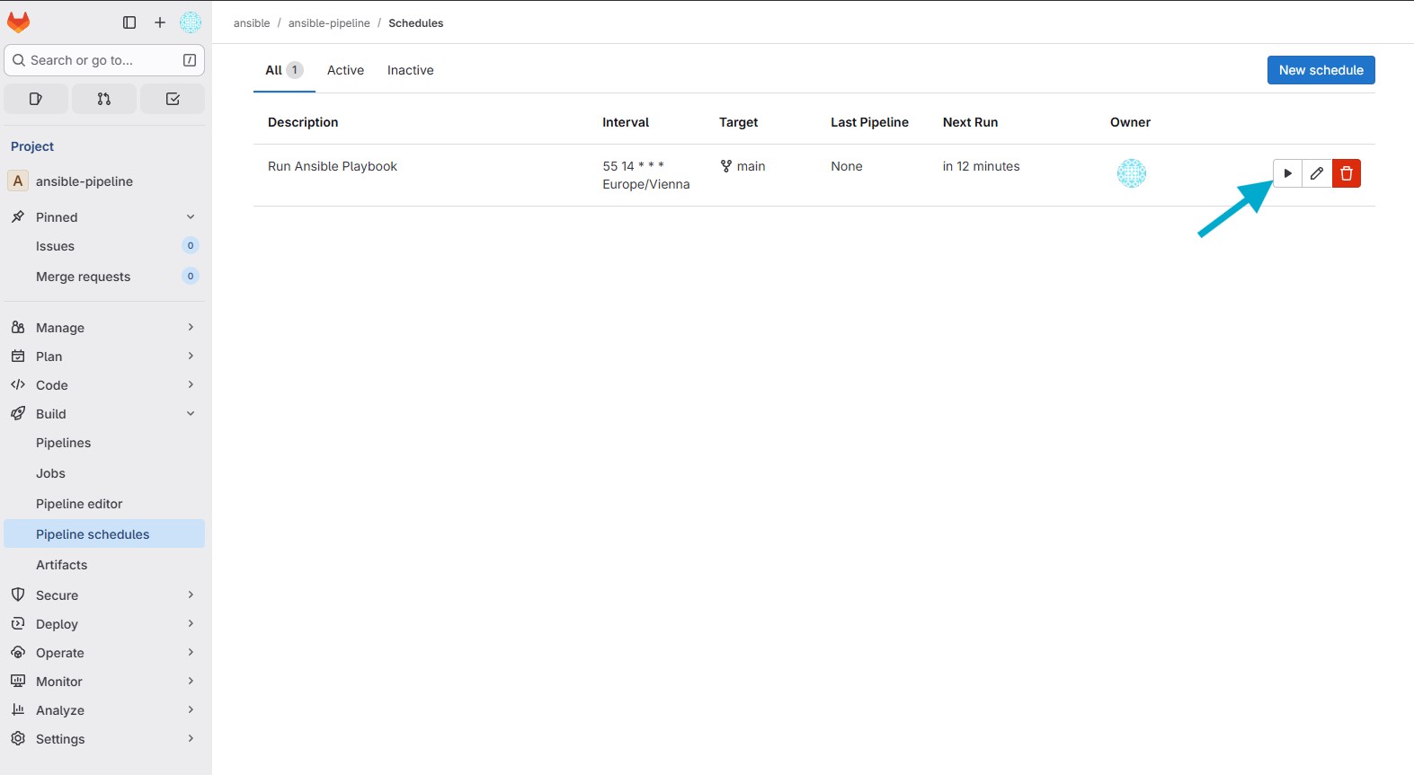 - Go to: “Build” > “Pipeline schedules” > “Create a new pipeline schedule”
