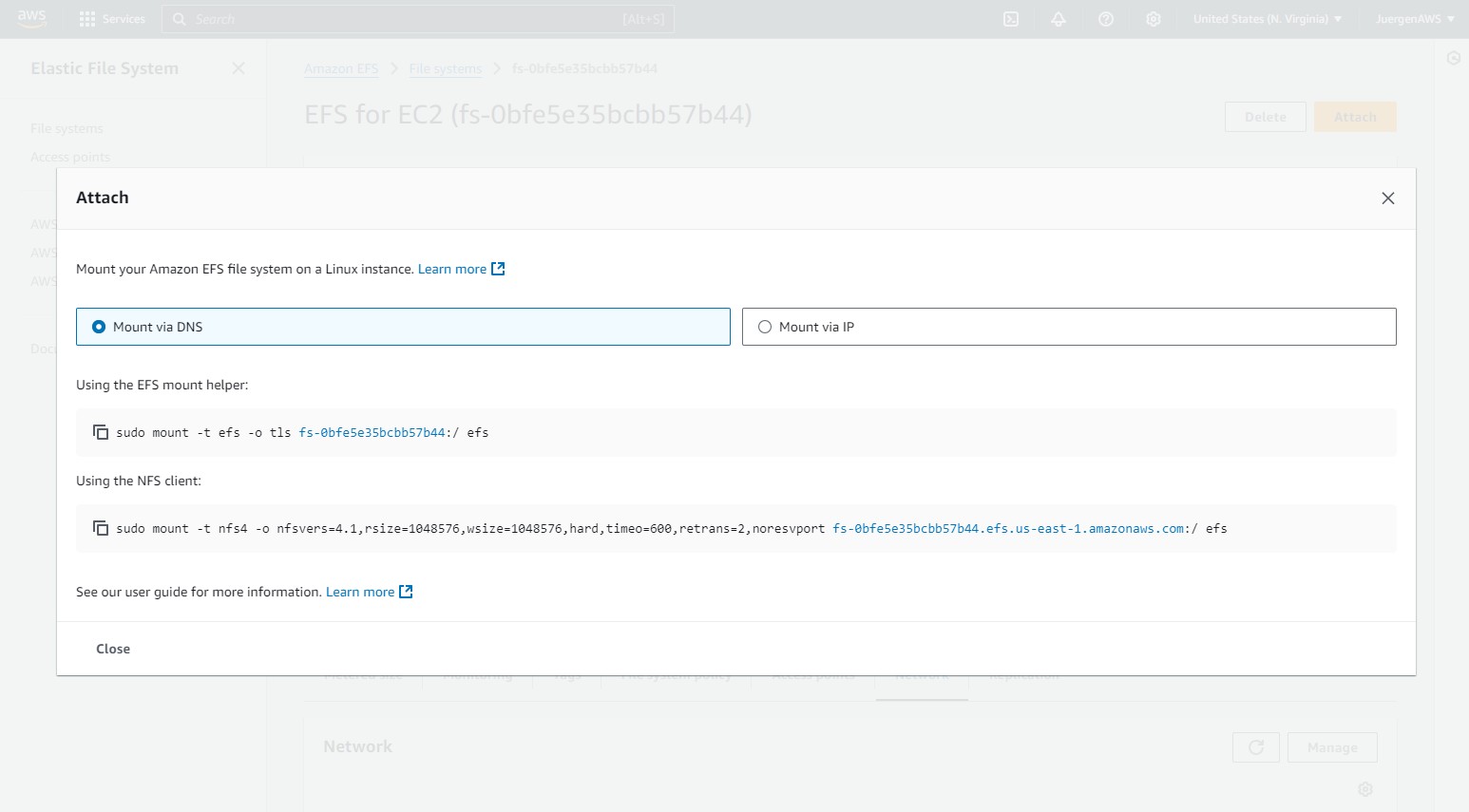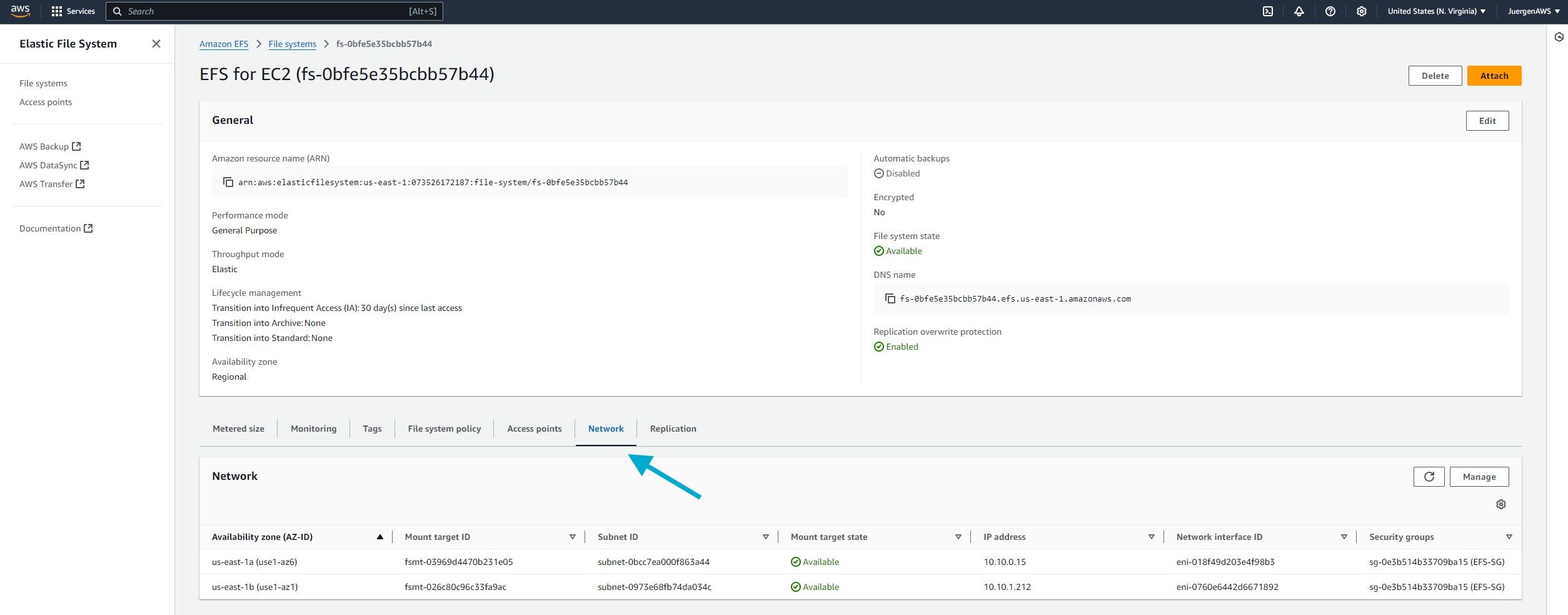 Open the AWS Management Console https://us-east-1.console.aws.amazon.com/efs/home?region=us-east-1#/file-systems/