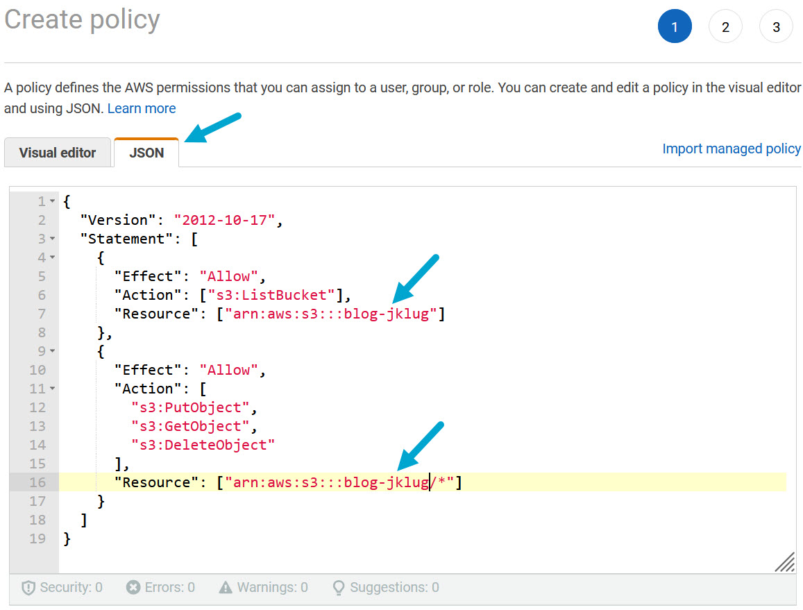 Move to JSON tab and replace the default policy with the following policy:
