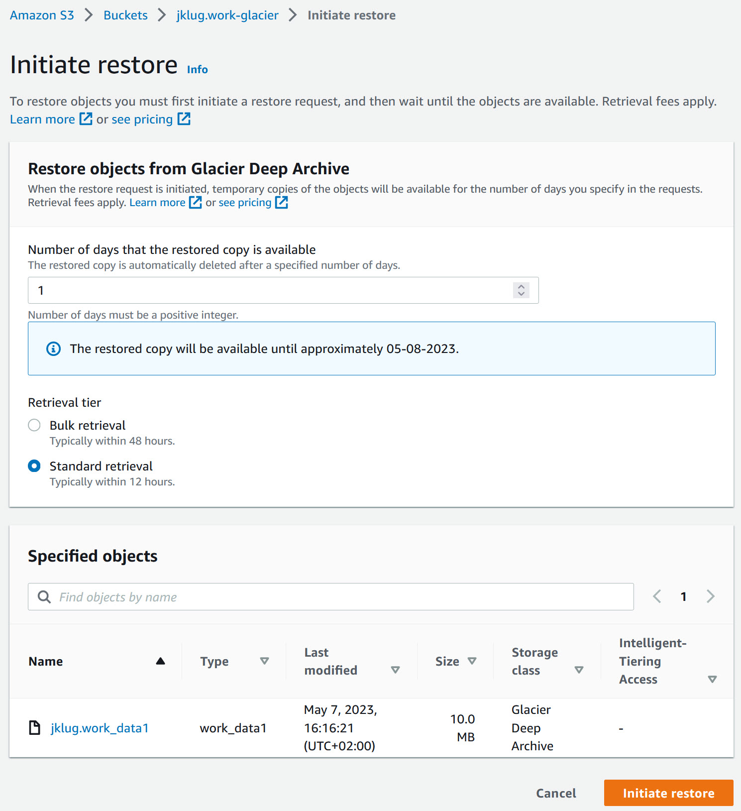 --restore-request Days=1,,GlacierJobParameters={"Tier"="Standard"}