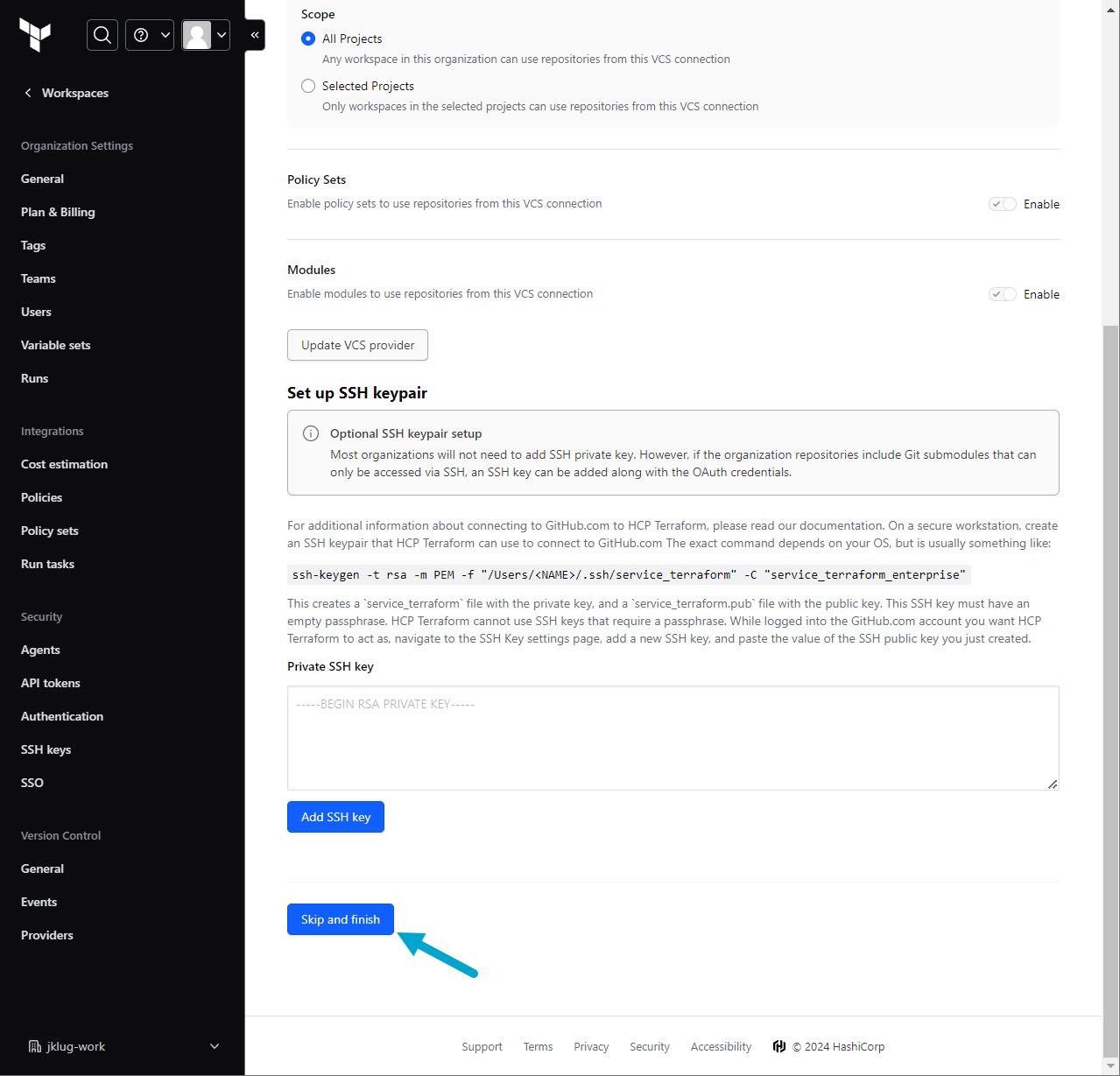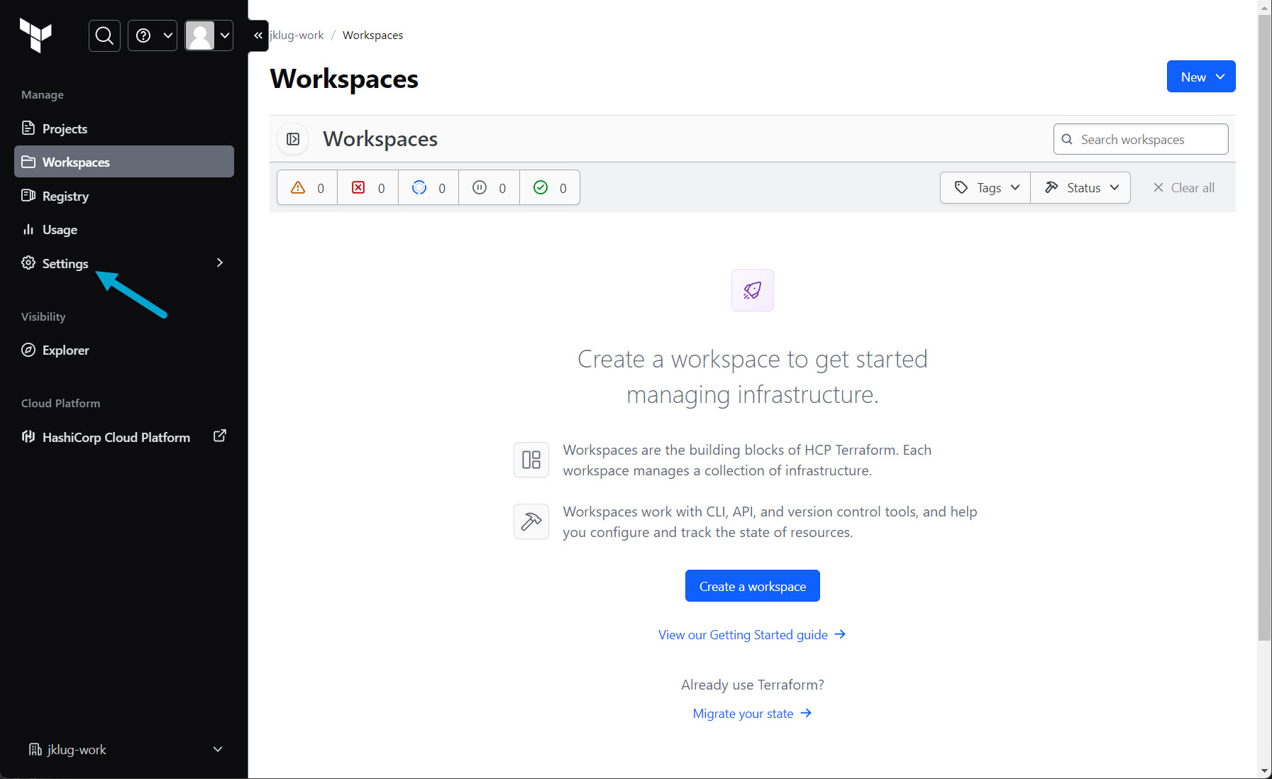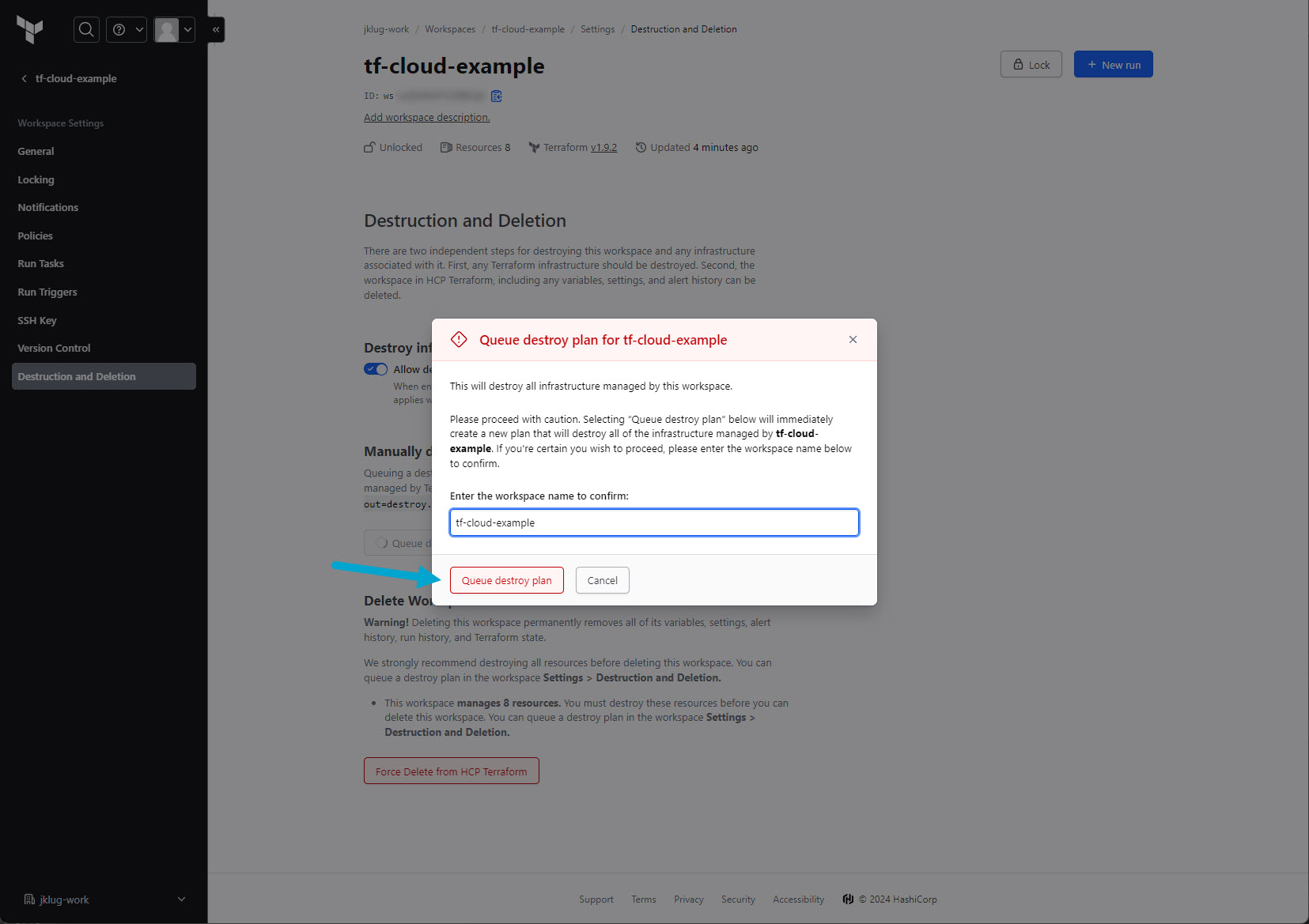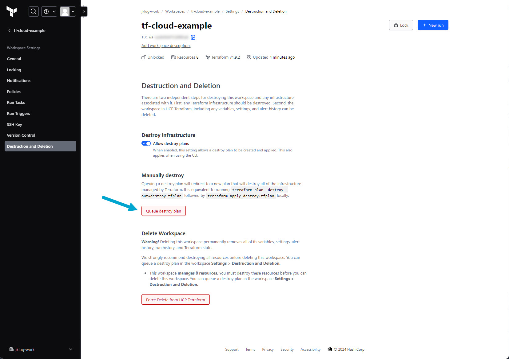 Go to: “tf-cloud-example” workspace > “Settings”