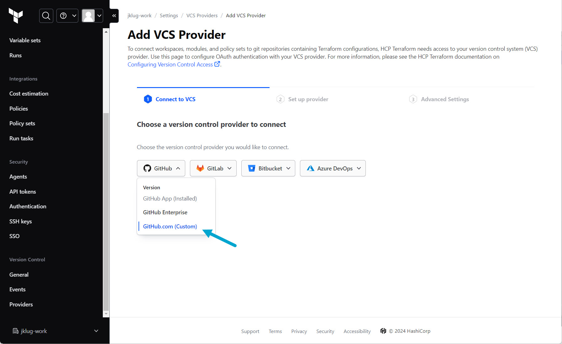 - Select the “GitHub.com (Custom)” version control provider