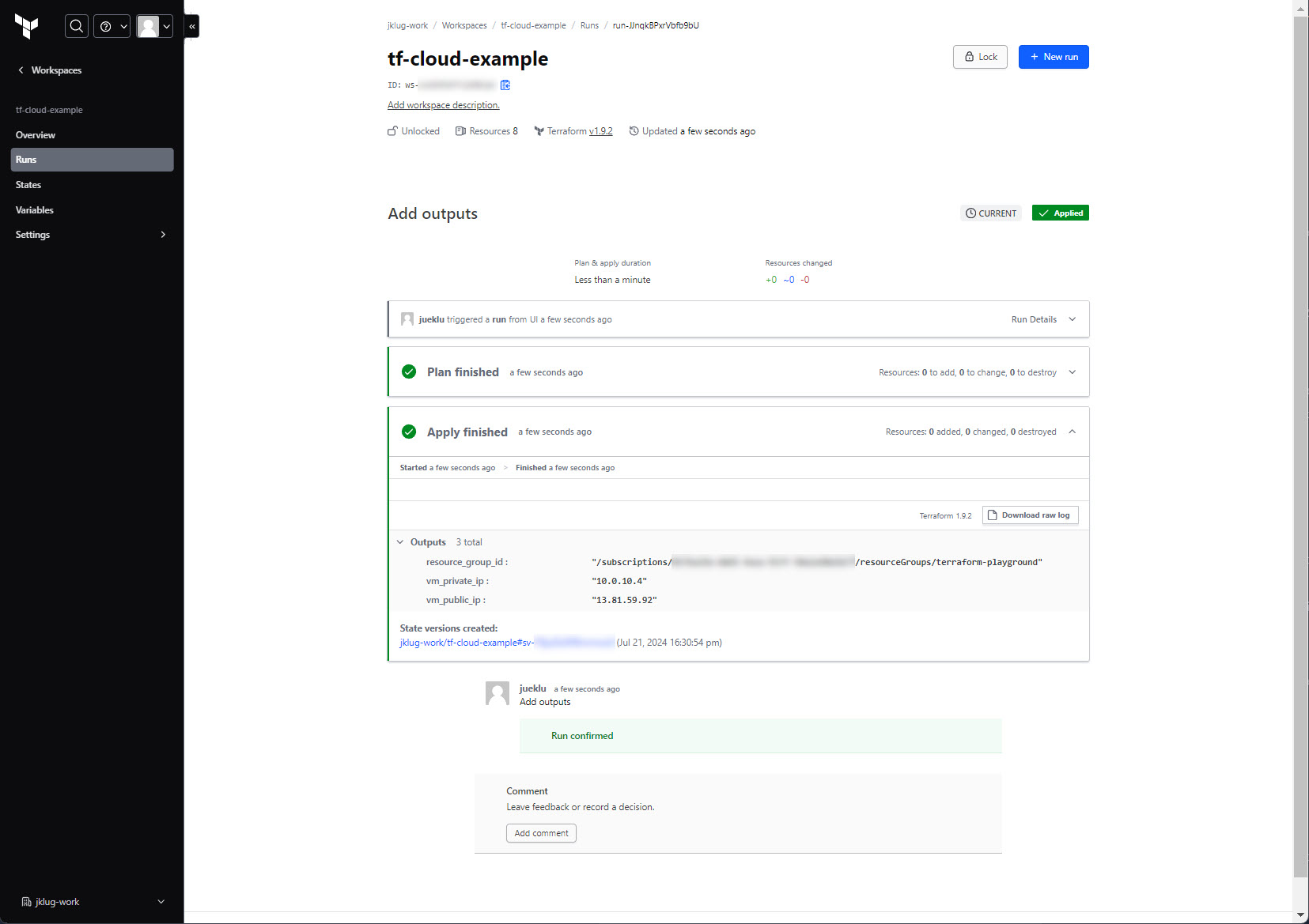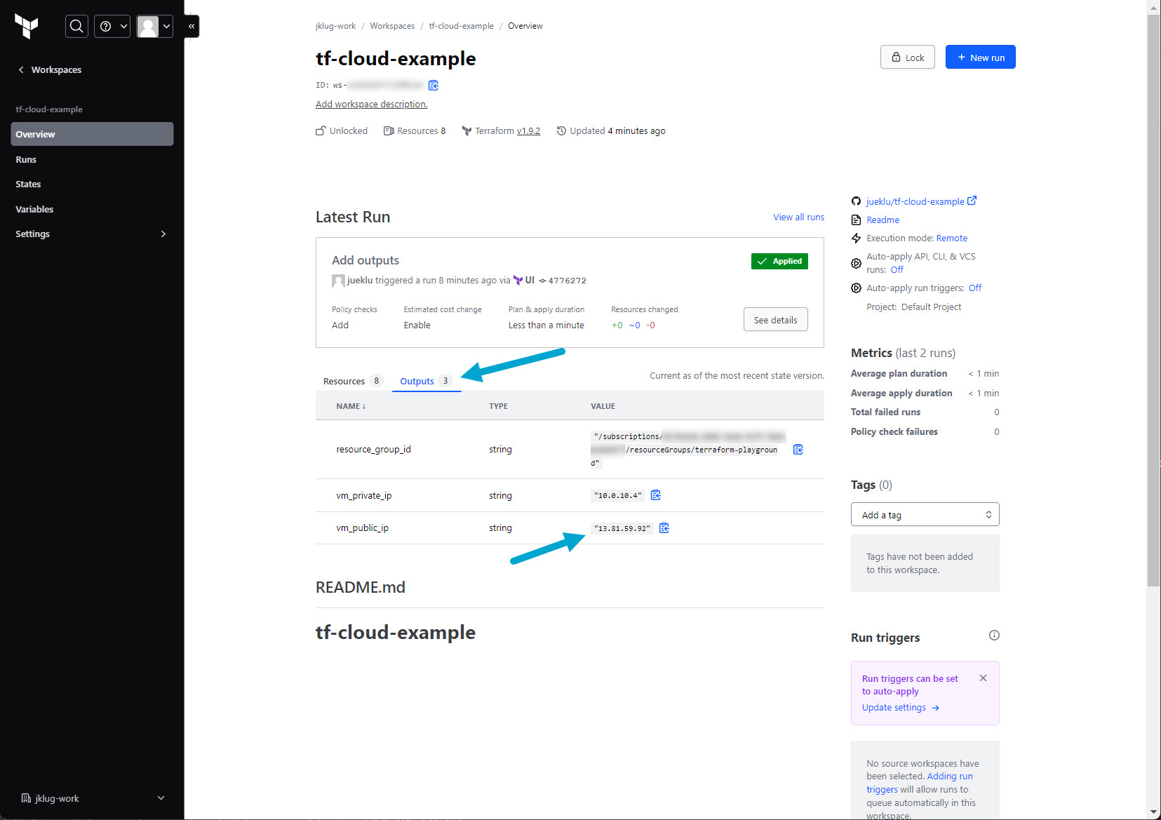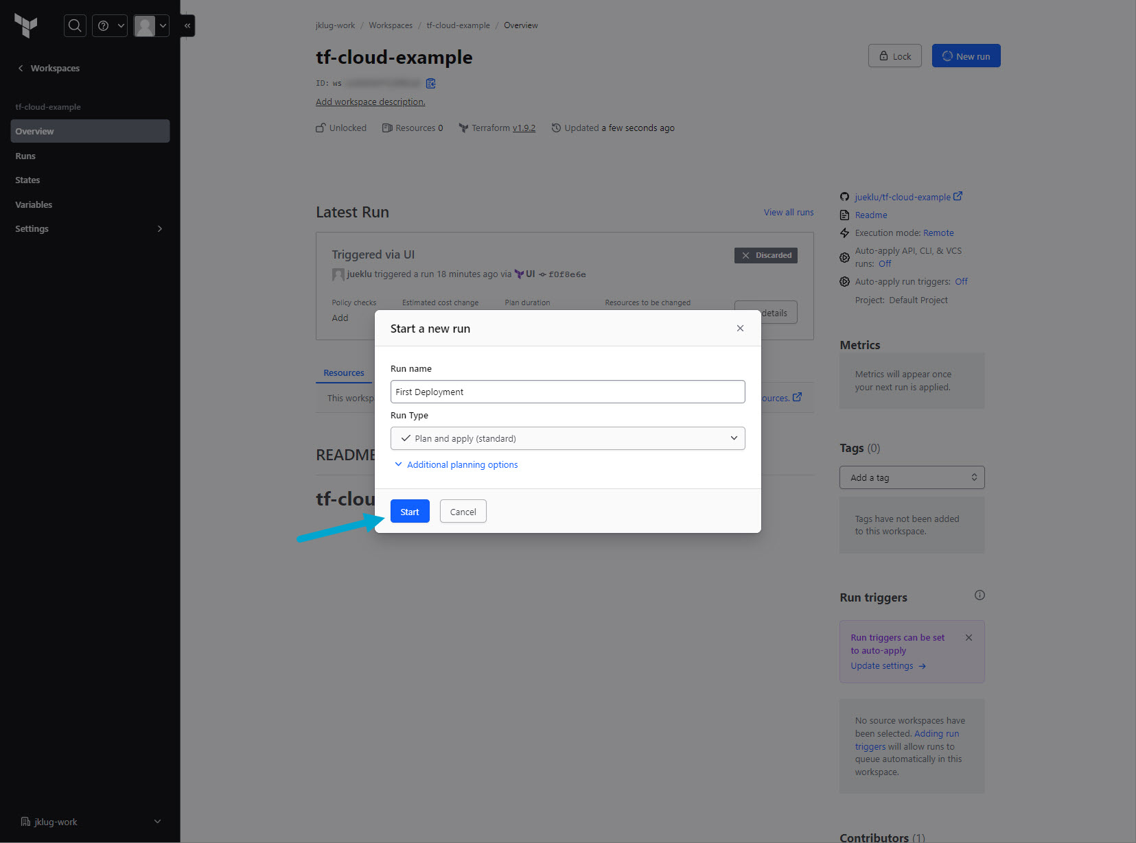 Go to: “tf-cloud-example” workspace > “Overview”