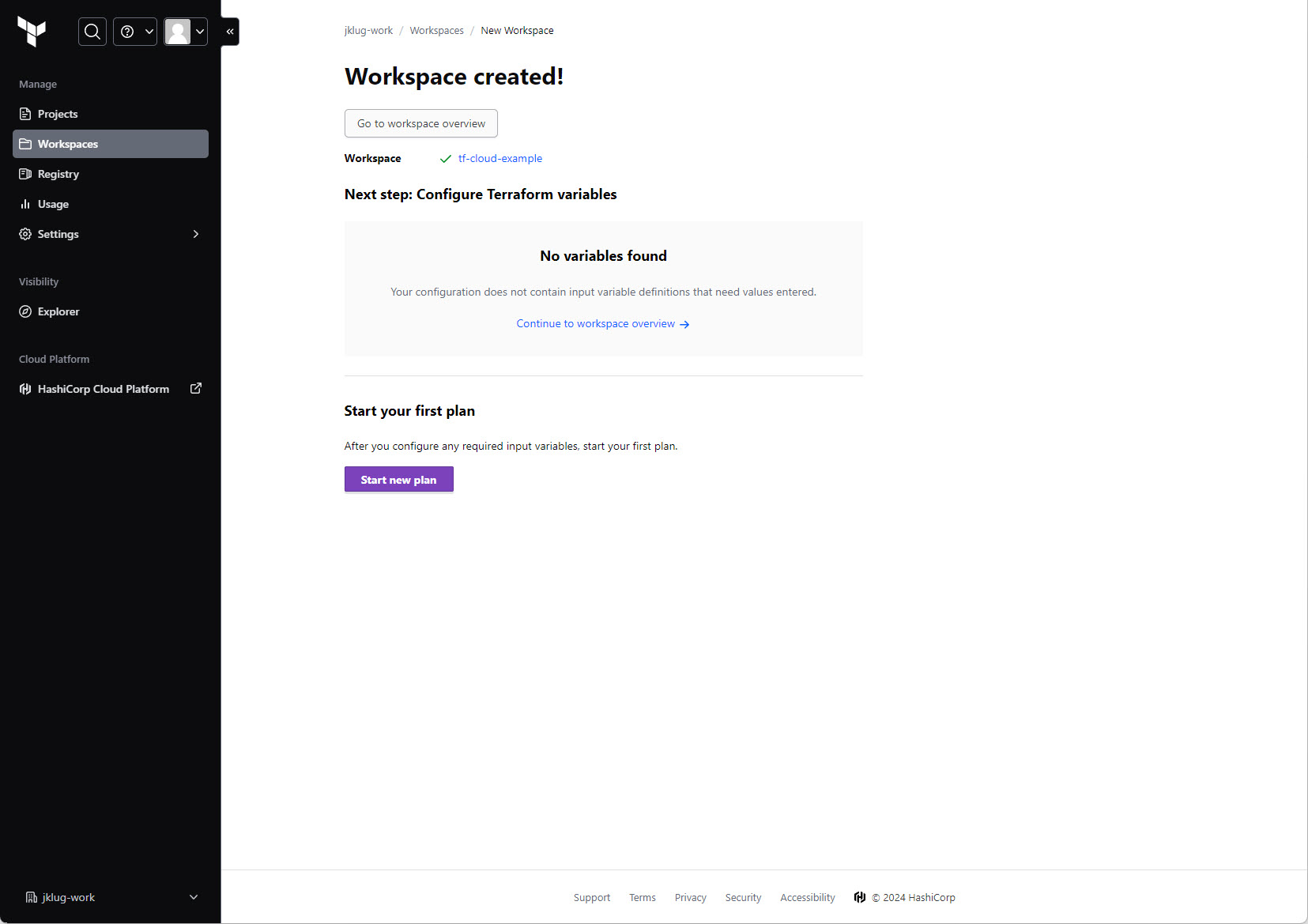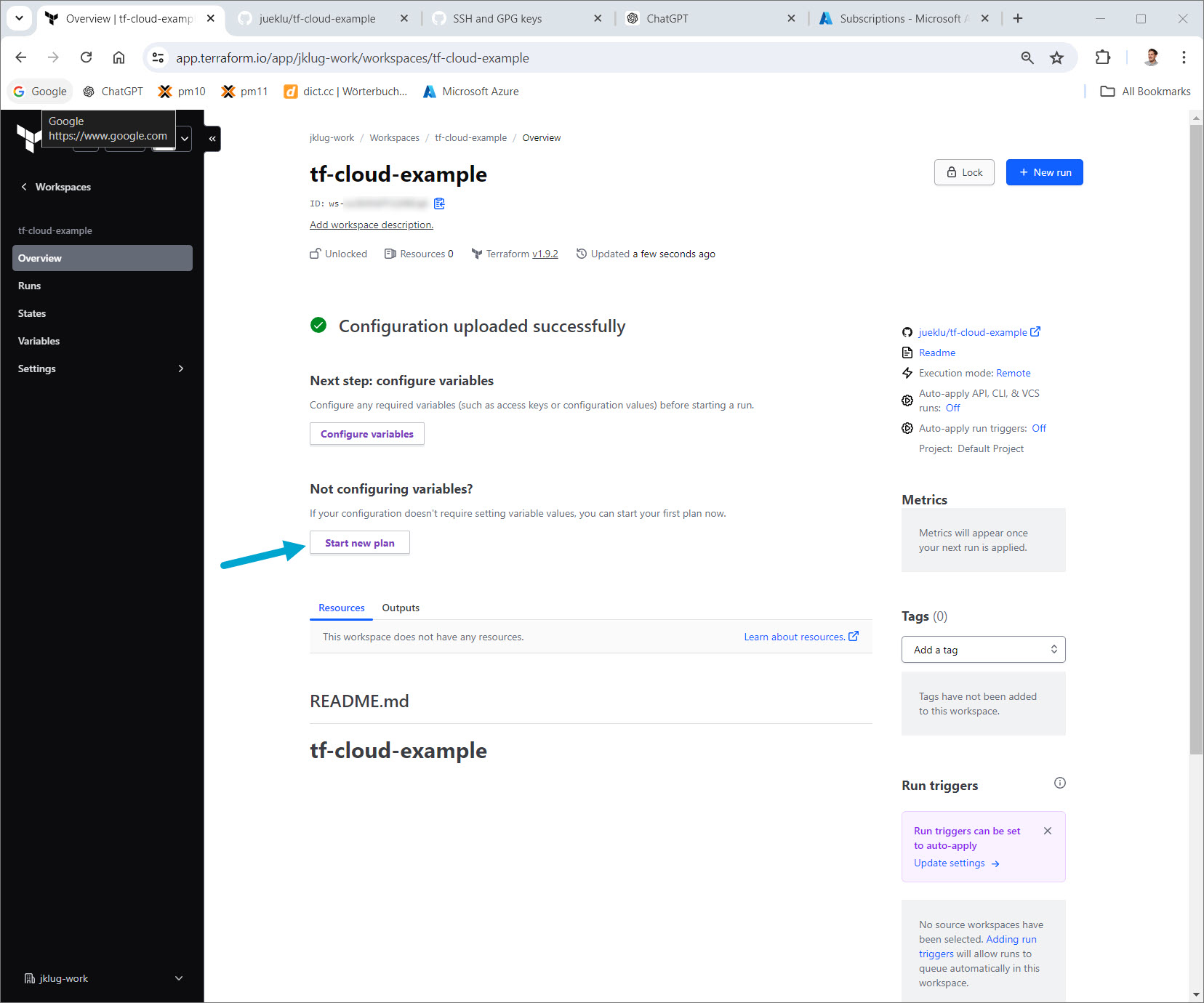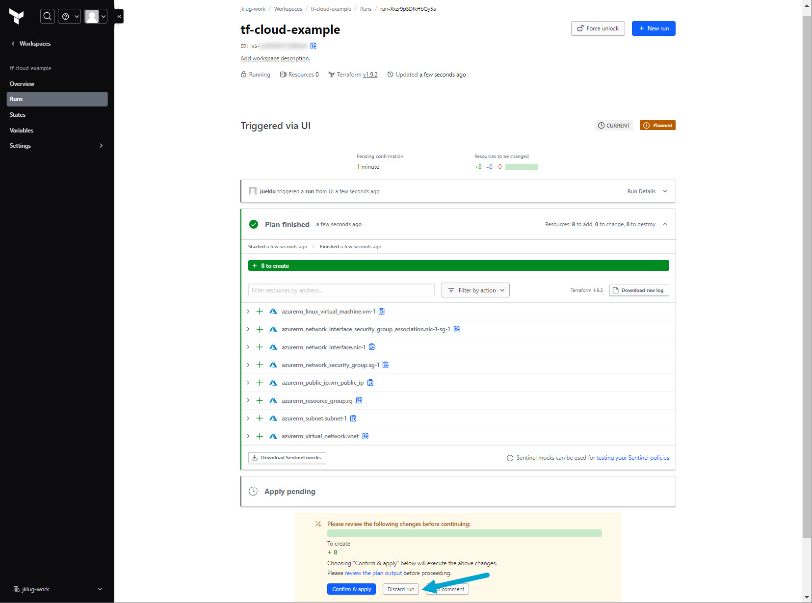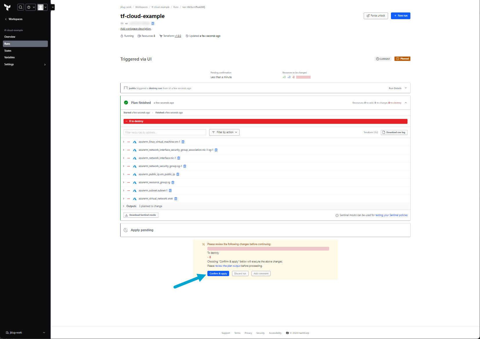 Go to: “tf-cloud-example” workspace > “Overview”