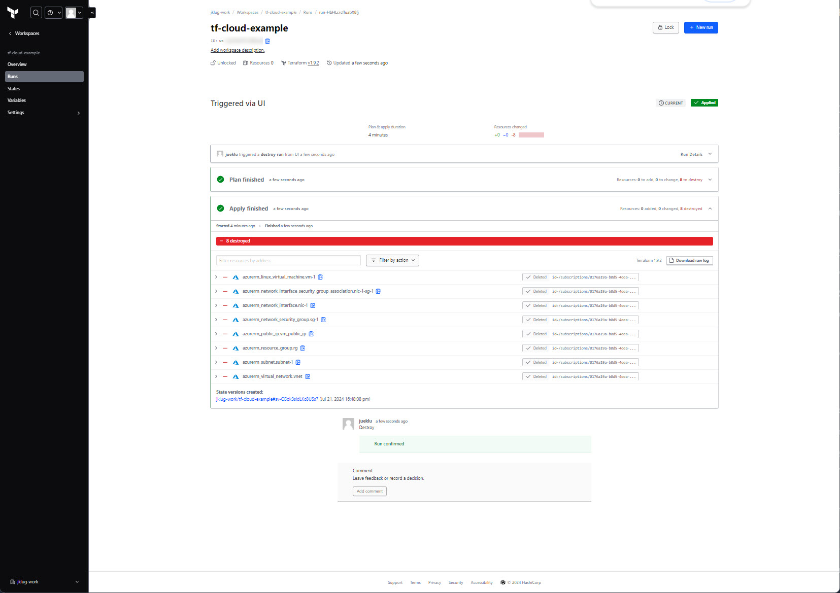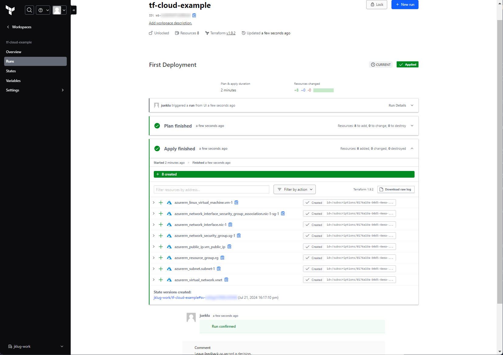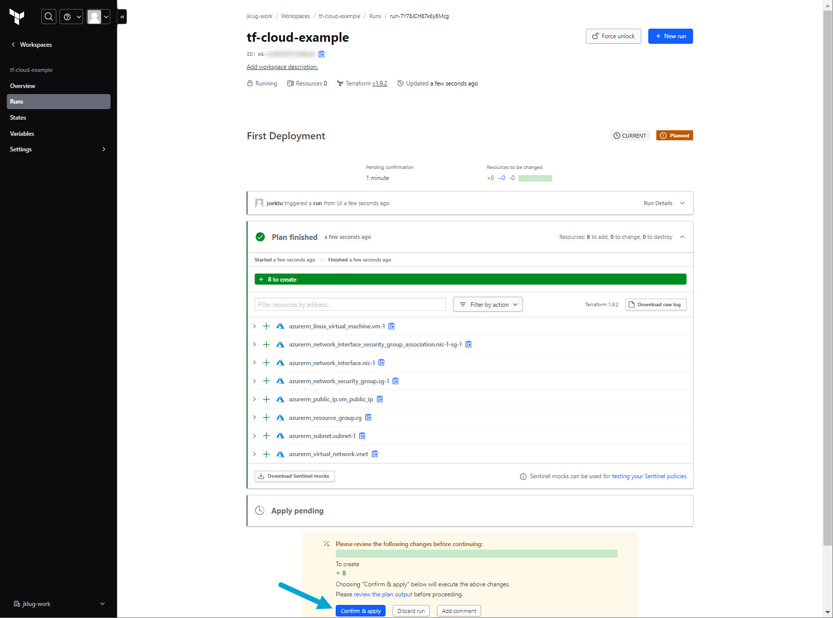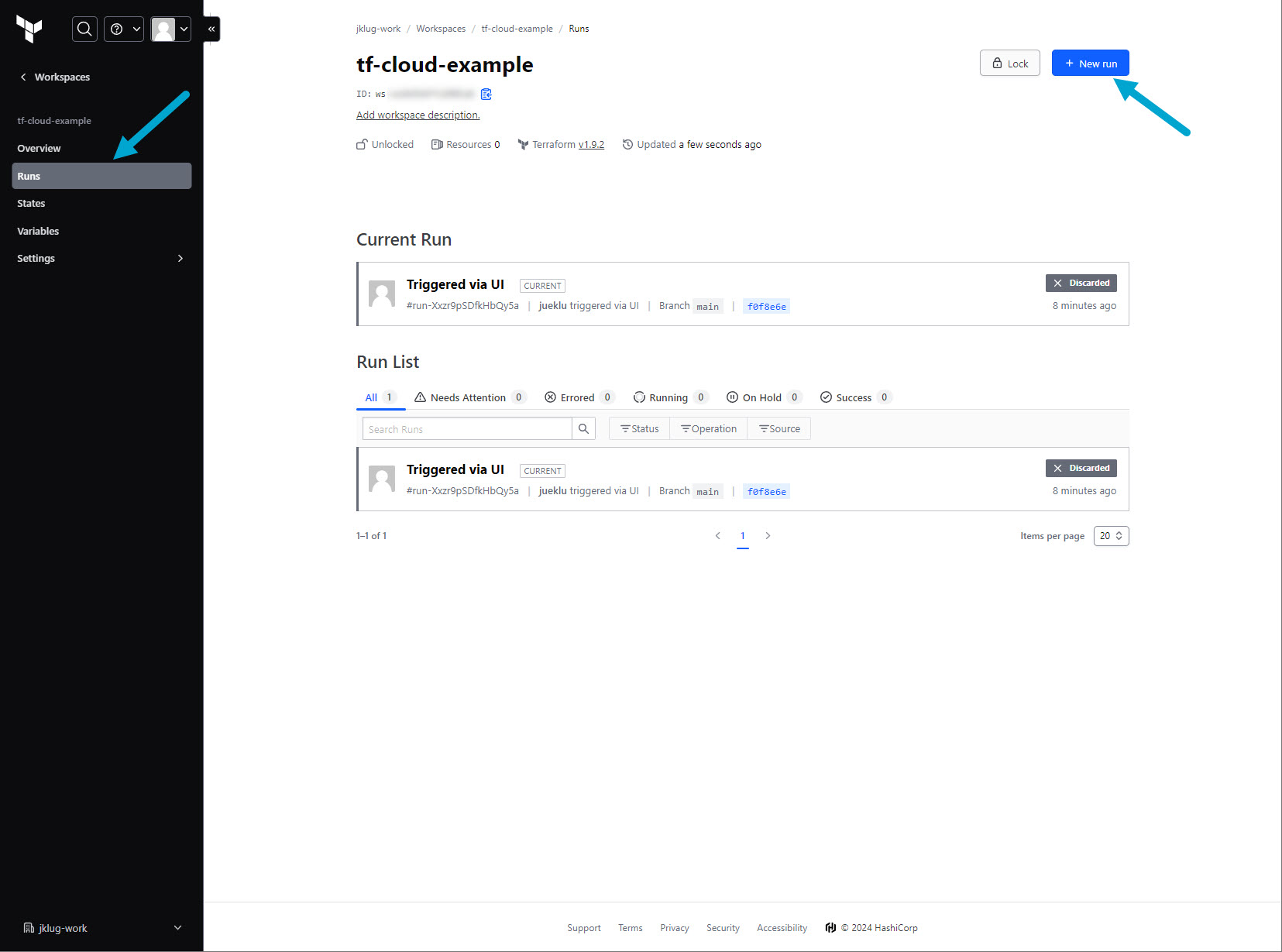 Go to: “tf-cloud-example” workspace > “Runs”