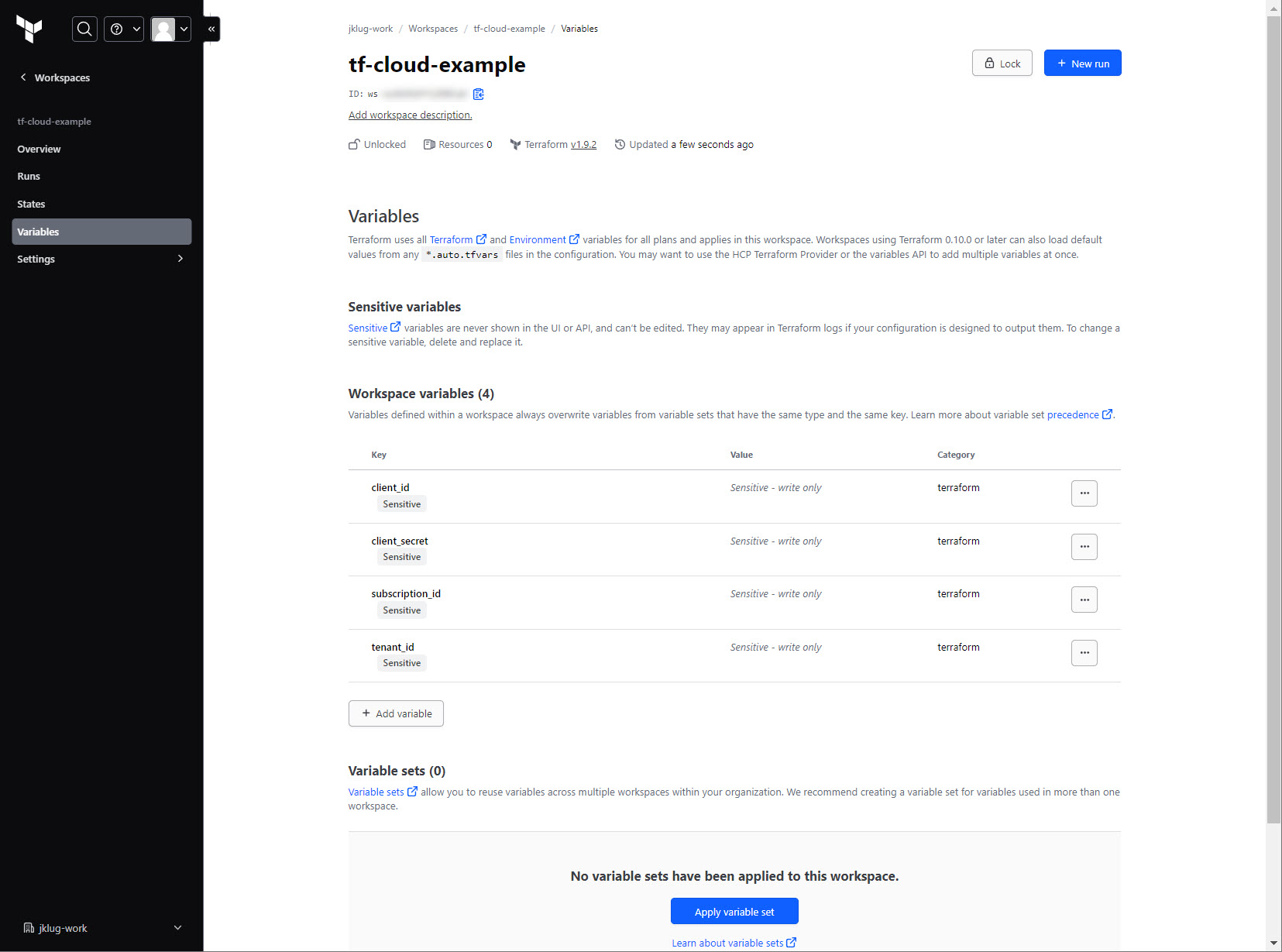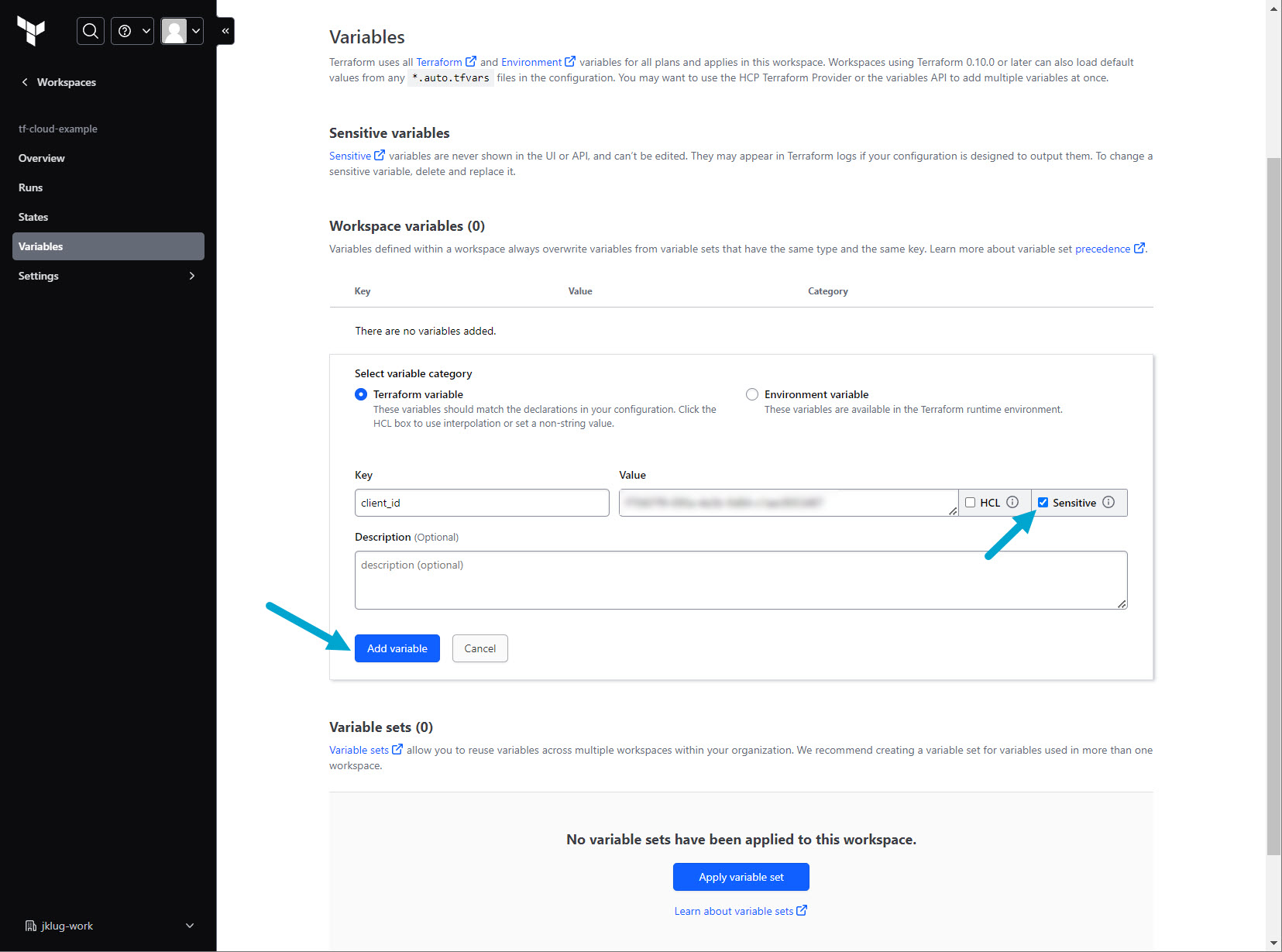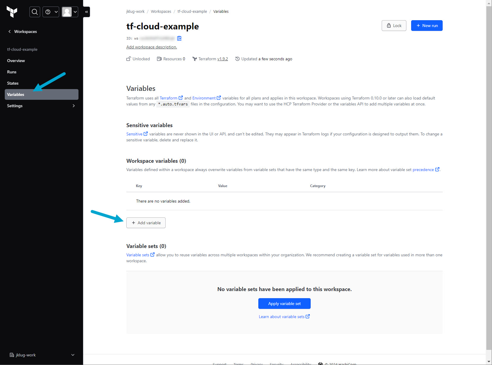 Go to: “tf-cloud-example” Workspace > “Variables”