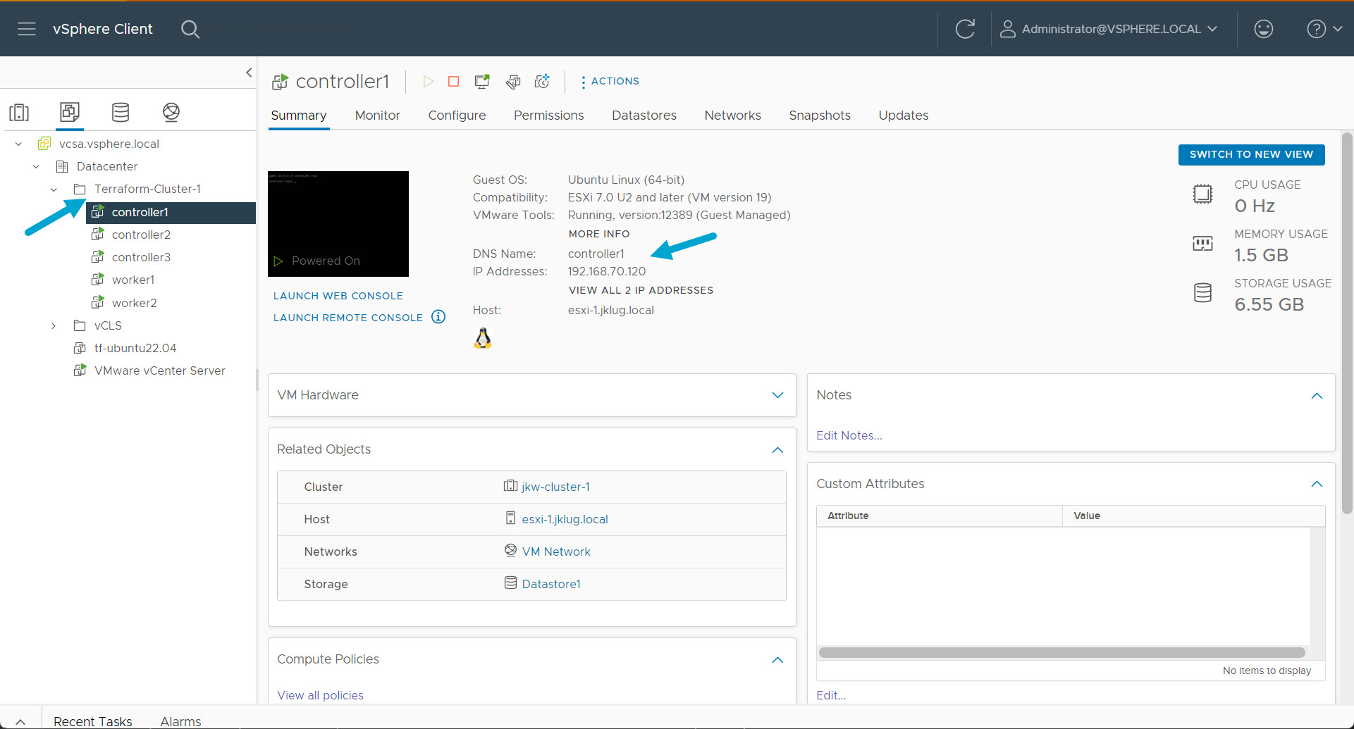 The following configuration below creates VMs with custom names / hostnames and ascending IP addresses. The VMs are deployed in a folder named “Terraform-Cluster-1”:
