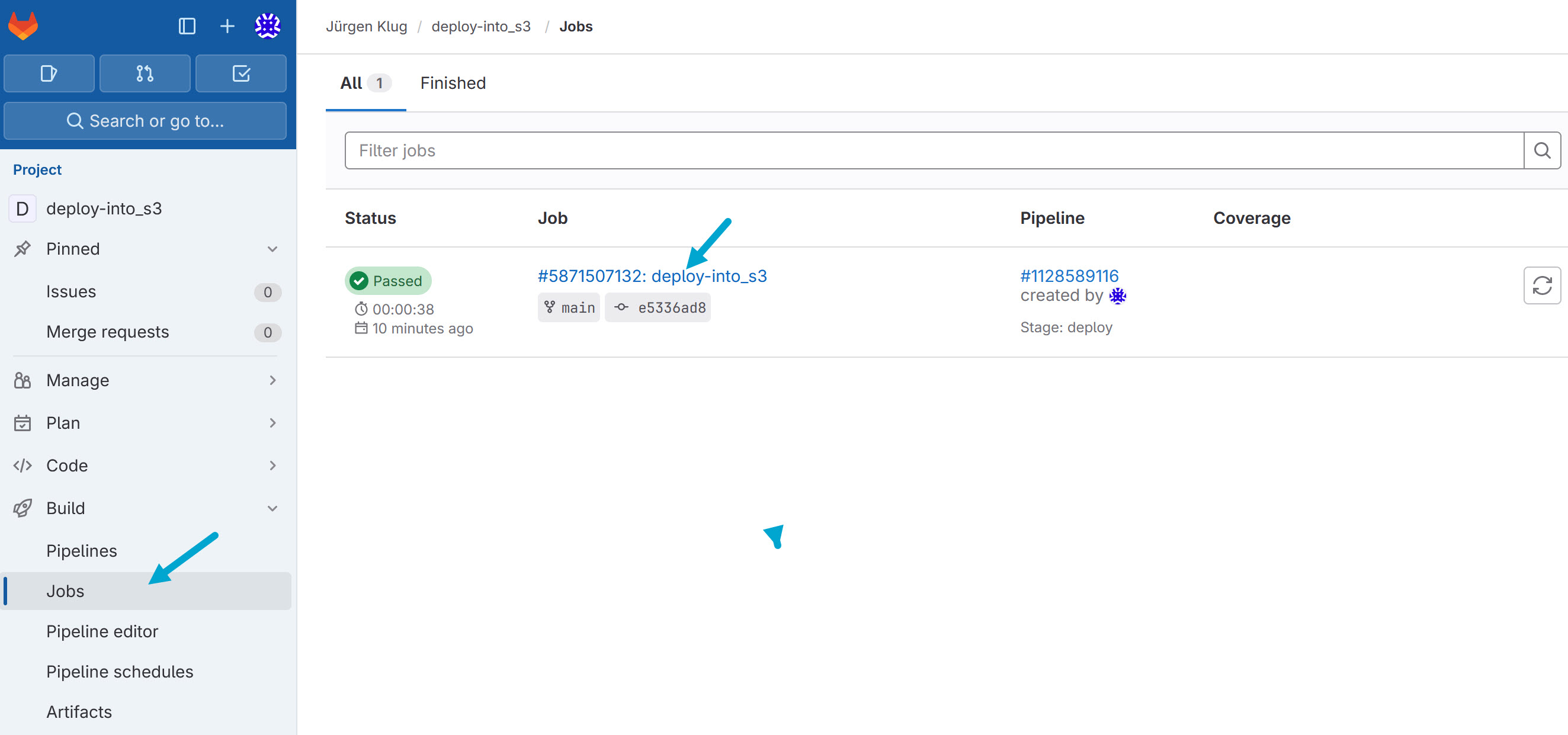 Build>Jobsand click on the job for the logs.