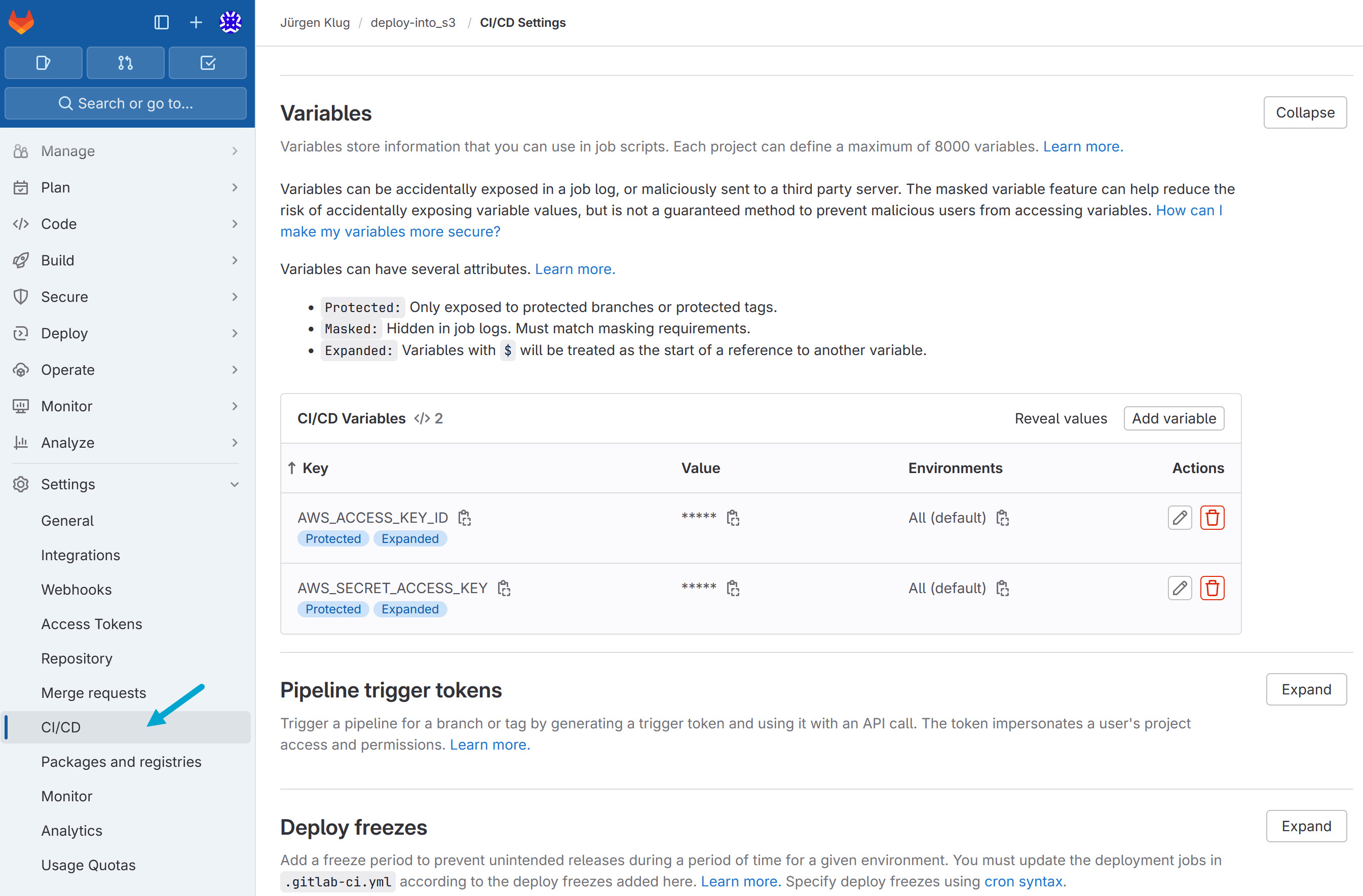 Add the Access keys of your IAM user as variables to the GitLab project.