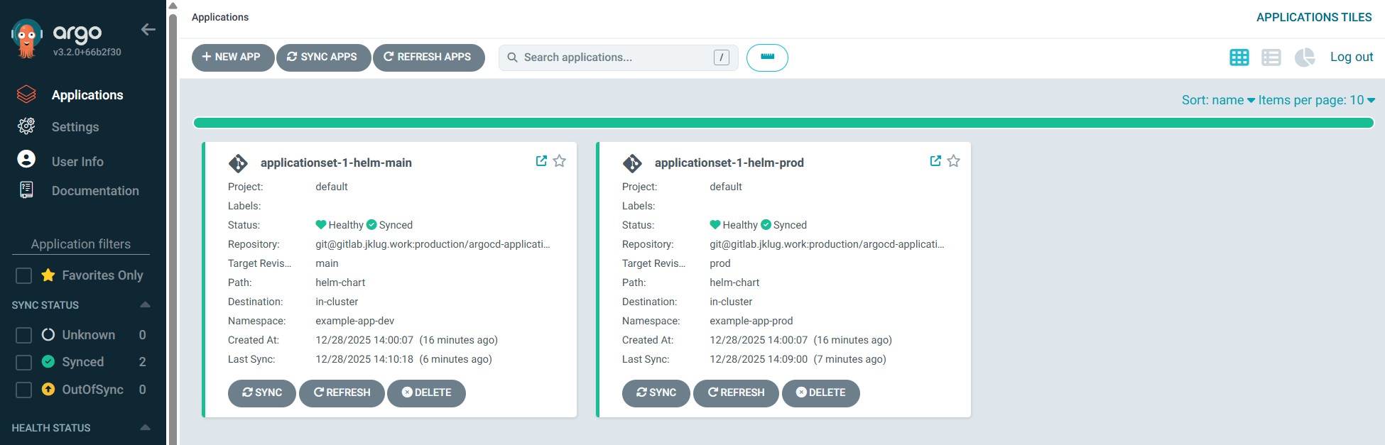 argocd/applicationset-1-helm-main https://kubernetes.default.svc example-app-dev default Synced Healthy Auto-Prune <none> git@gitlab.jklug.work:production/argocd-applicationsets/applicationset-1-helm.git helm-chart main