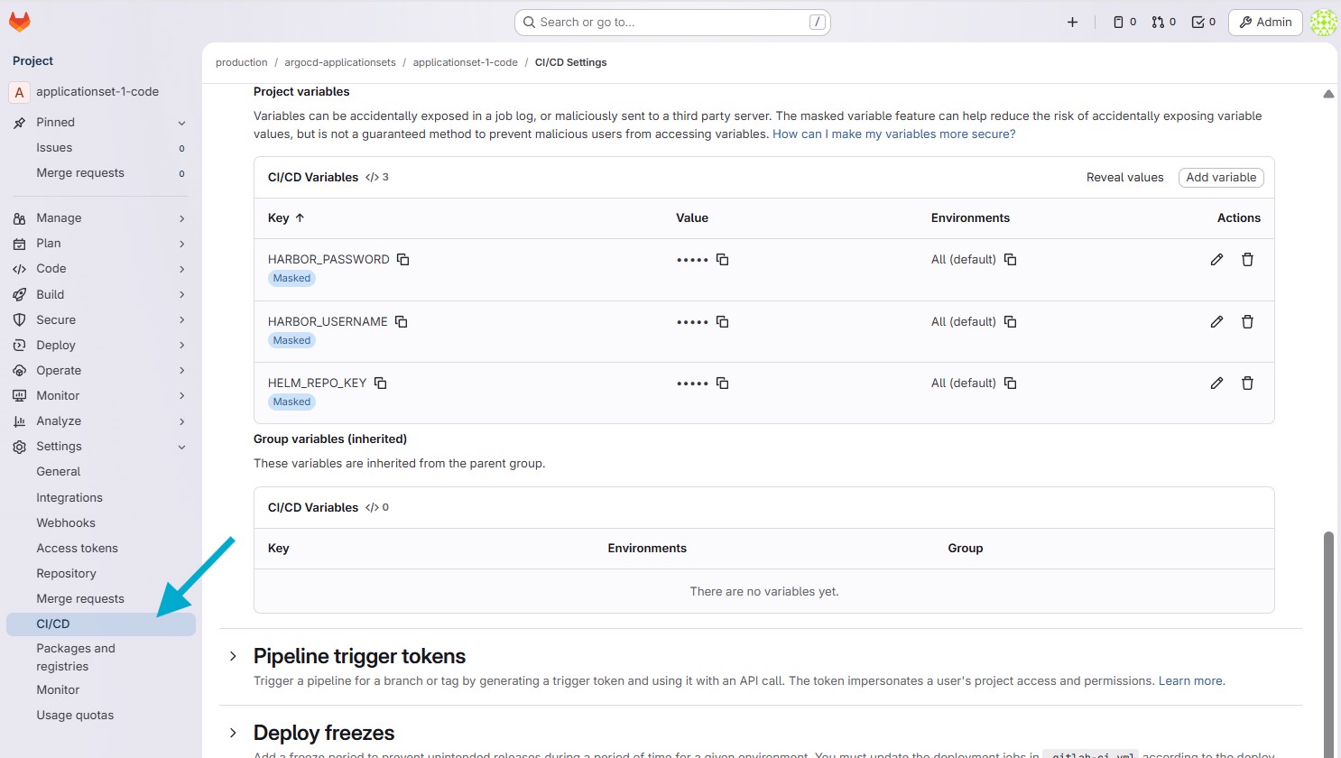 Add the credentials for the Harbor Project as GitLab CI/CD Variables: