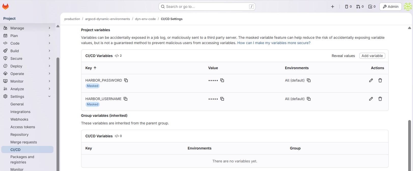 Add the credentials for the Harbor Project as GitLab CI/CD Variables: