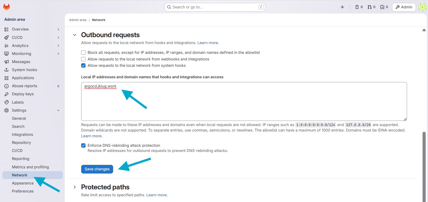 If “outbound request filtering” is enabled, GitLab can reject webhook URLs with “Invalid URL given” unless the destination is whitelisted.