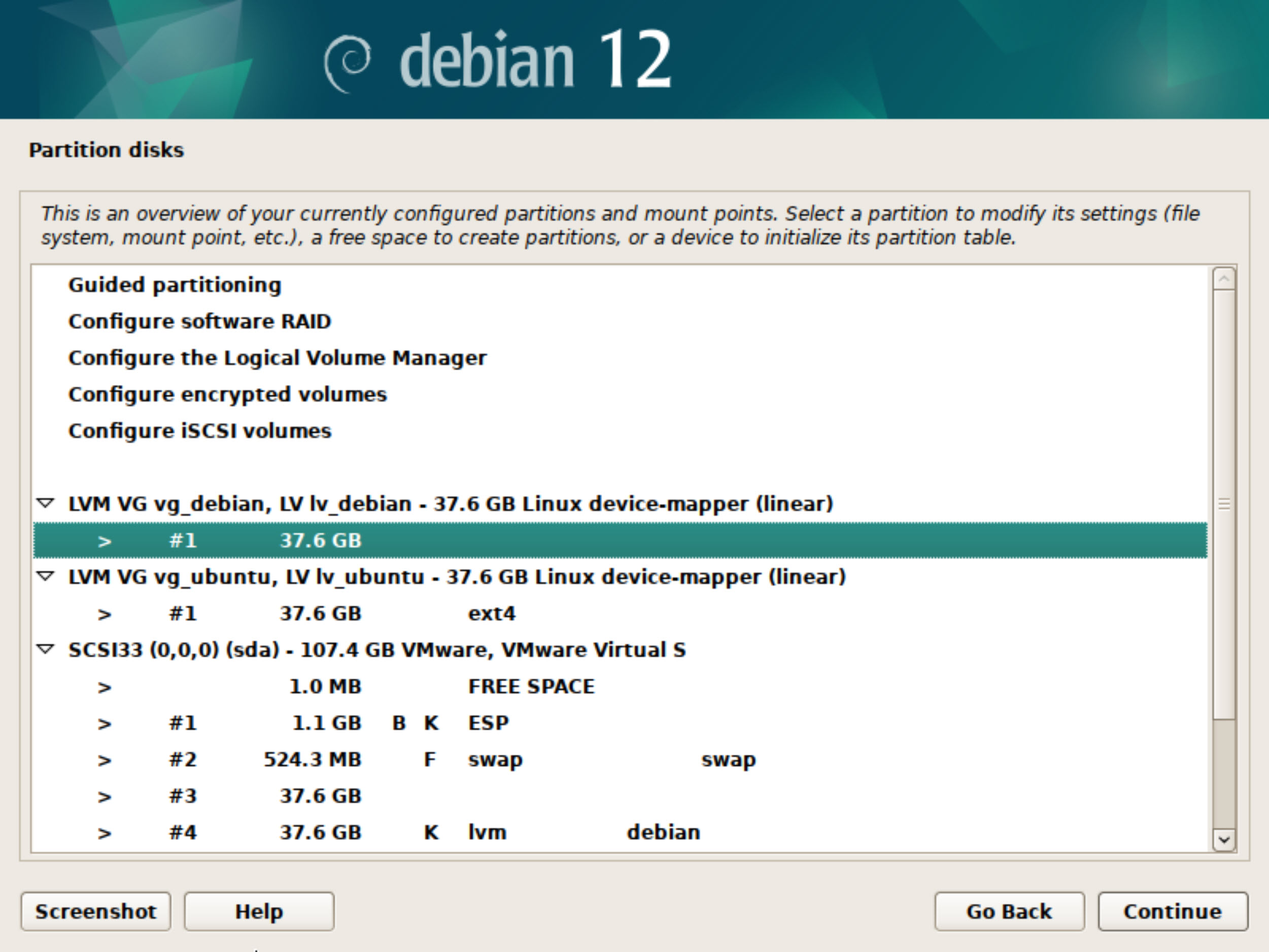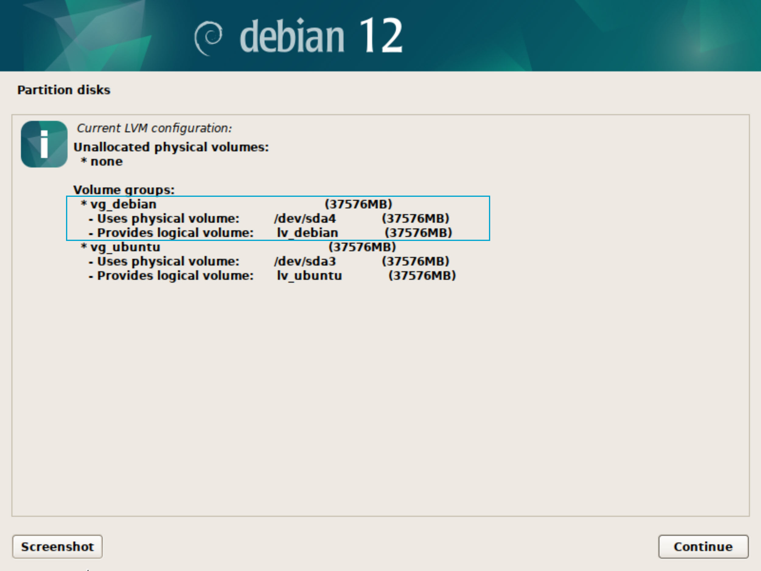 This Tutorial I’m setting up a dual-boot system with Ubuntu and Debian Linux. For both distributions I use a custom Logical Volume Management (LVM) storage layout.