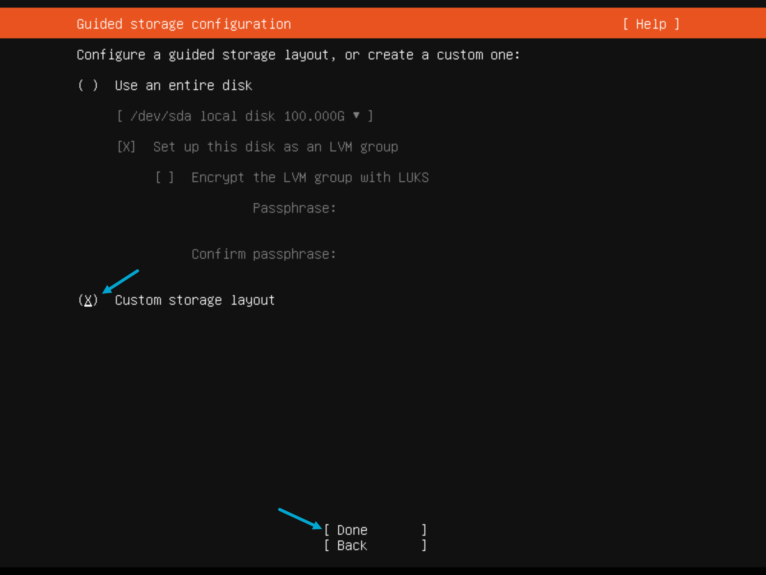 - Proceed with the Ubuntu Setup Wizard till you reach the “Guided storage configuration” and select “Custom storage layout”