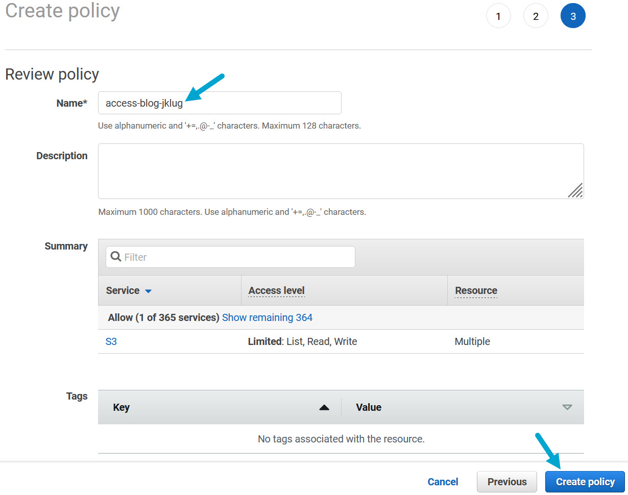 Create a new IAM policy to acces the S3 Bucket
