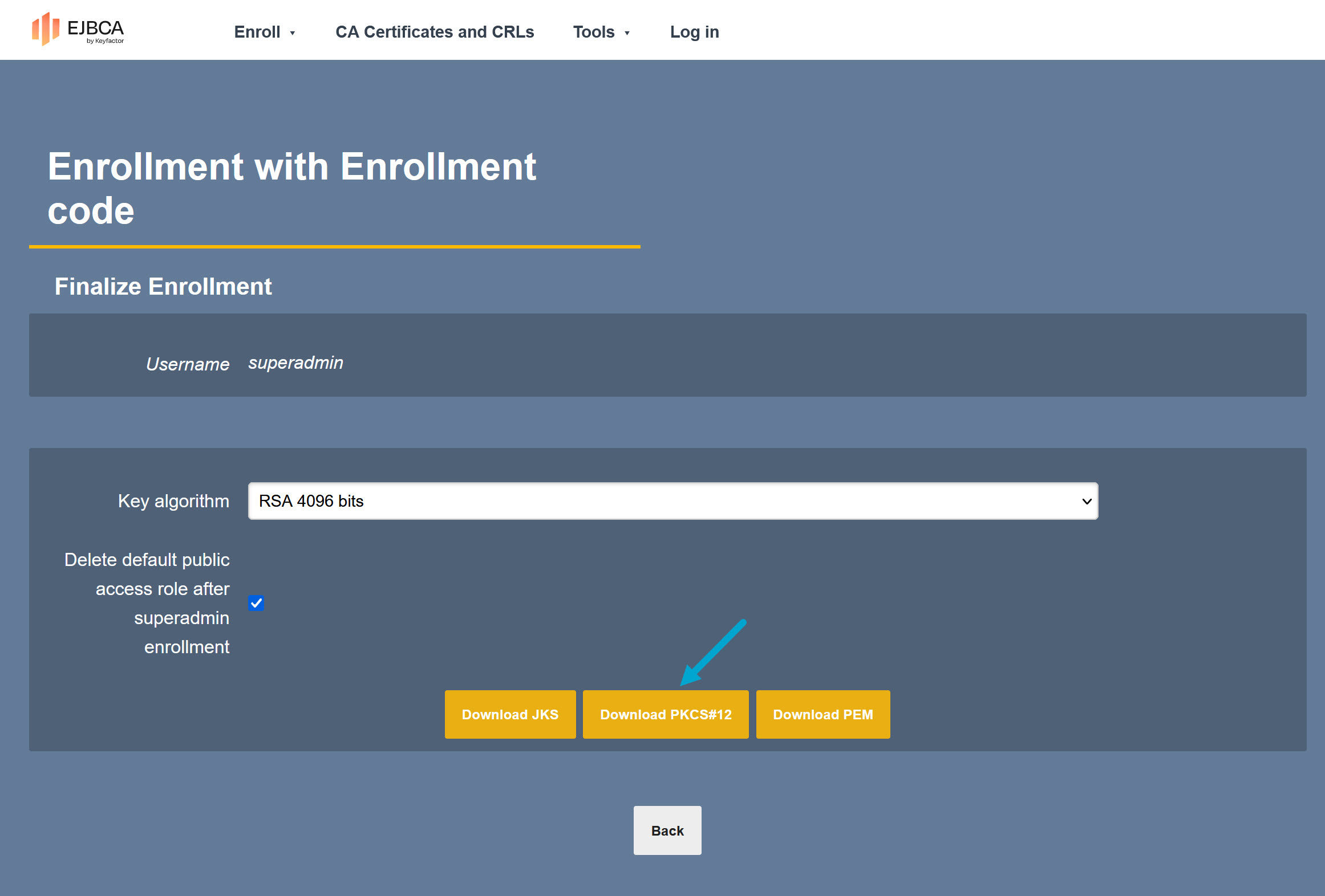 ejbca-ce | 2024-01-26 22:29:49,823+0000 INFO [/opt/keyfactor/bin/start.sh] (process:1) * Once the P12 is downloaded, use "QOVHATeCTRXi3EcqJLJDd4Xg" to import it. *
