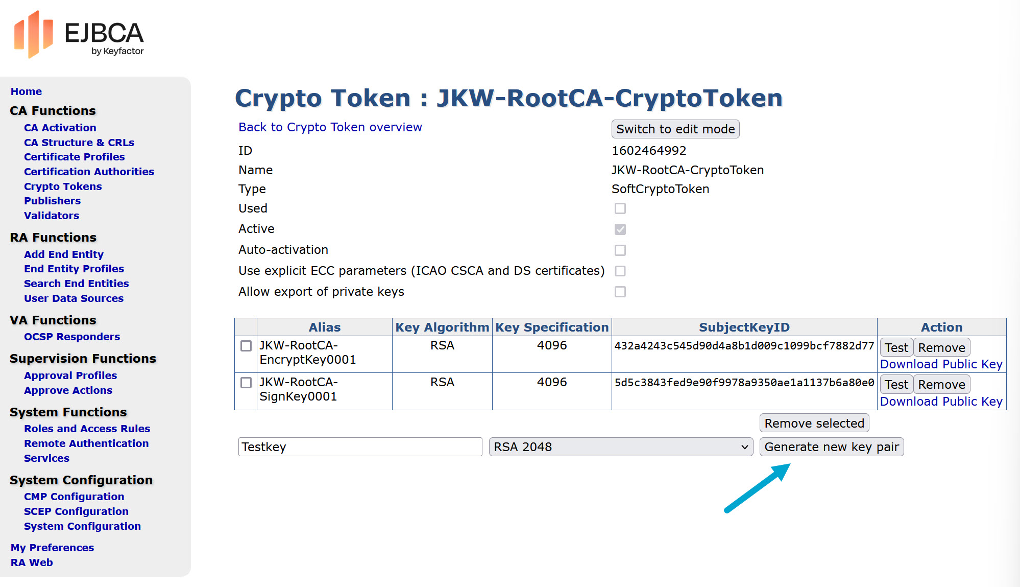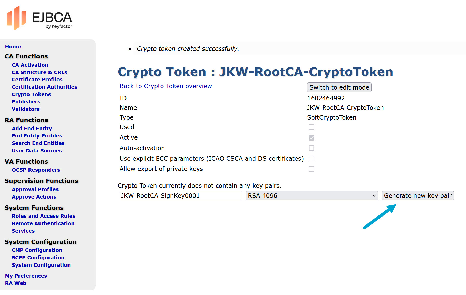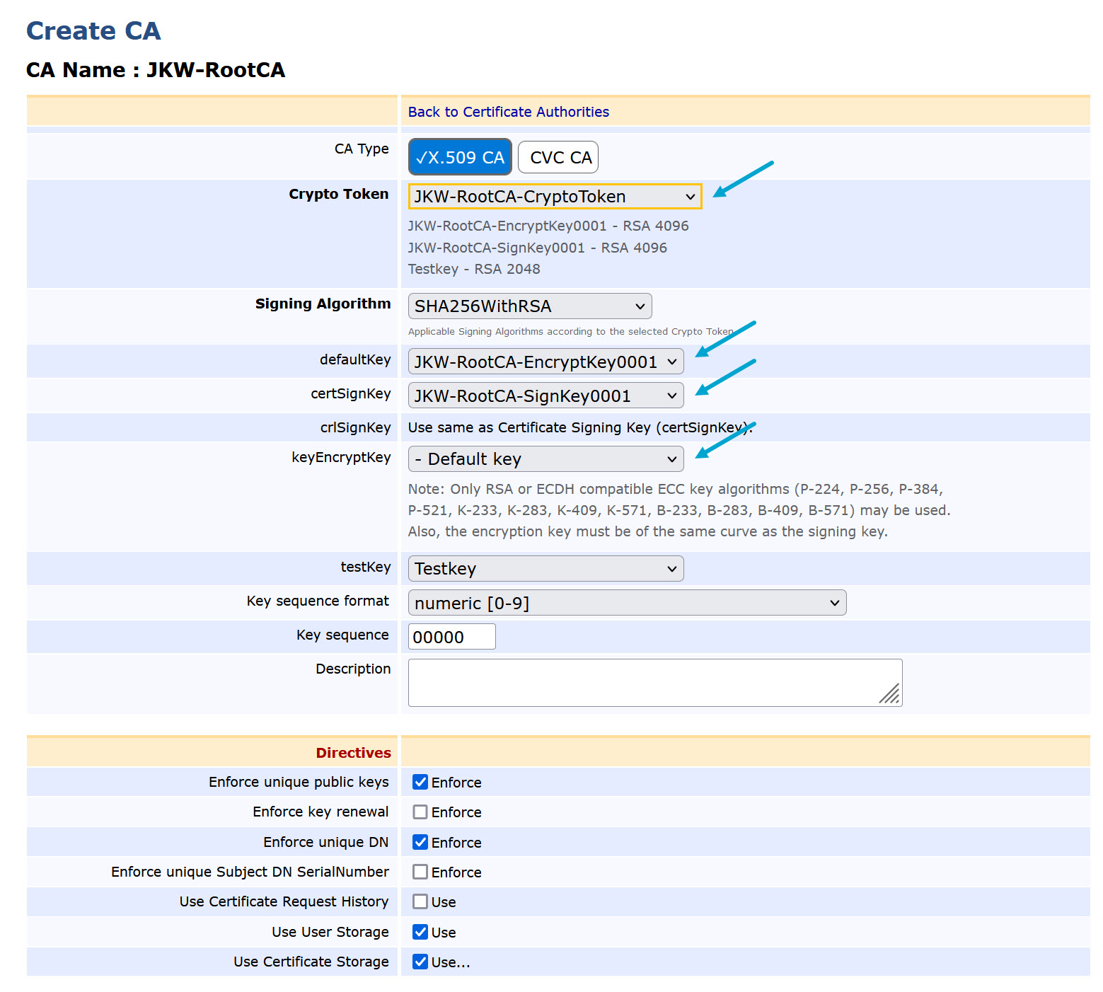 - Create a sign key “JKW-RootCA-SignKey0001” for the crypto token