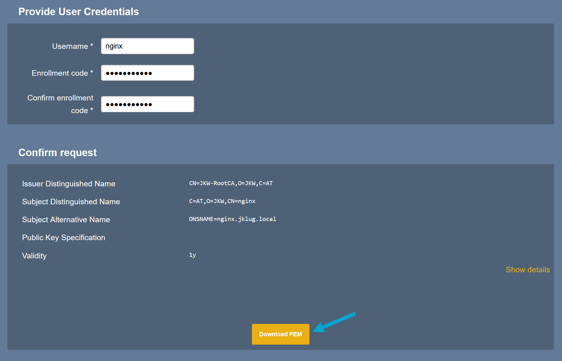 Note: EJBCA only exports one .pem certificate file that includes both the key and the chain. In the Nginx virtual host configuration just point both ssl_certificate and ssl_certificate_key to the same .pem certificate file.