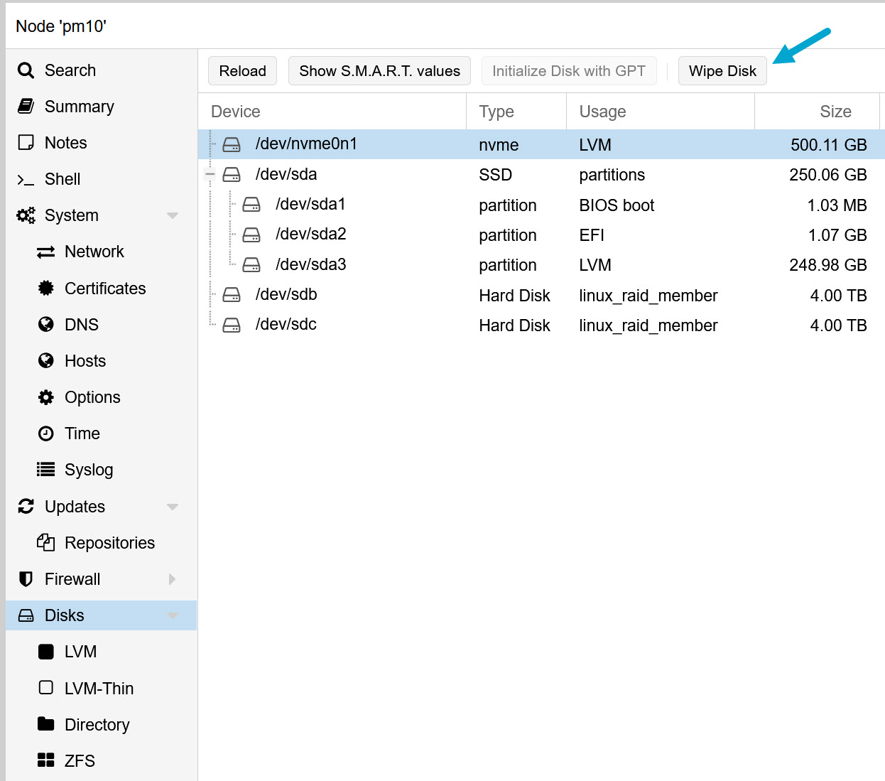 In my setup I use a SATA SSD for the Proxmox / Debian OS, a M2 SSD for the VM’s and 2 SATA disks for my file server VM.