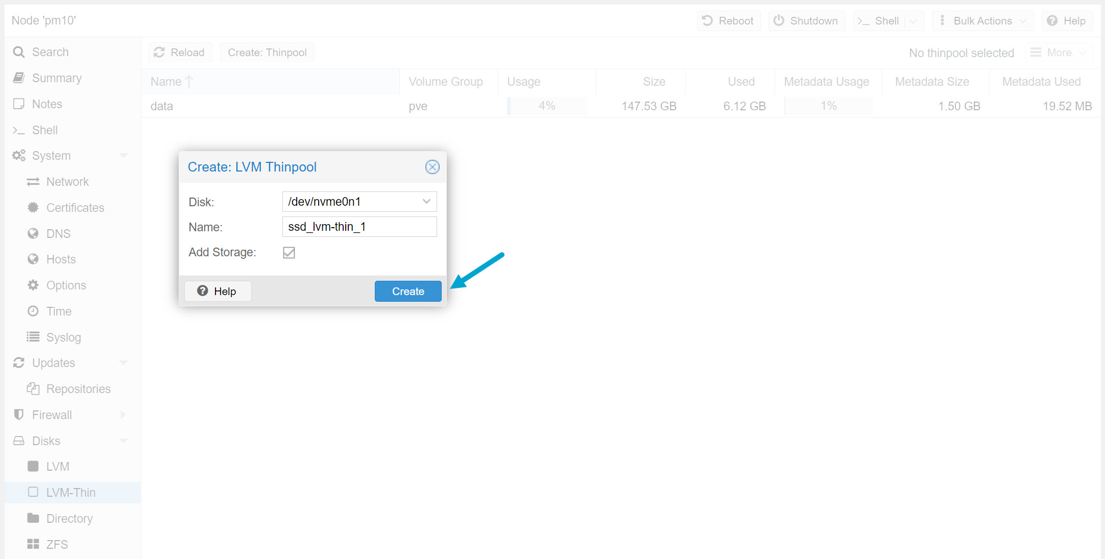 Let’s create an LVM-Thin Volume Group on the M2 SSD, this can be easily done within the GUI: