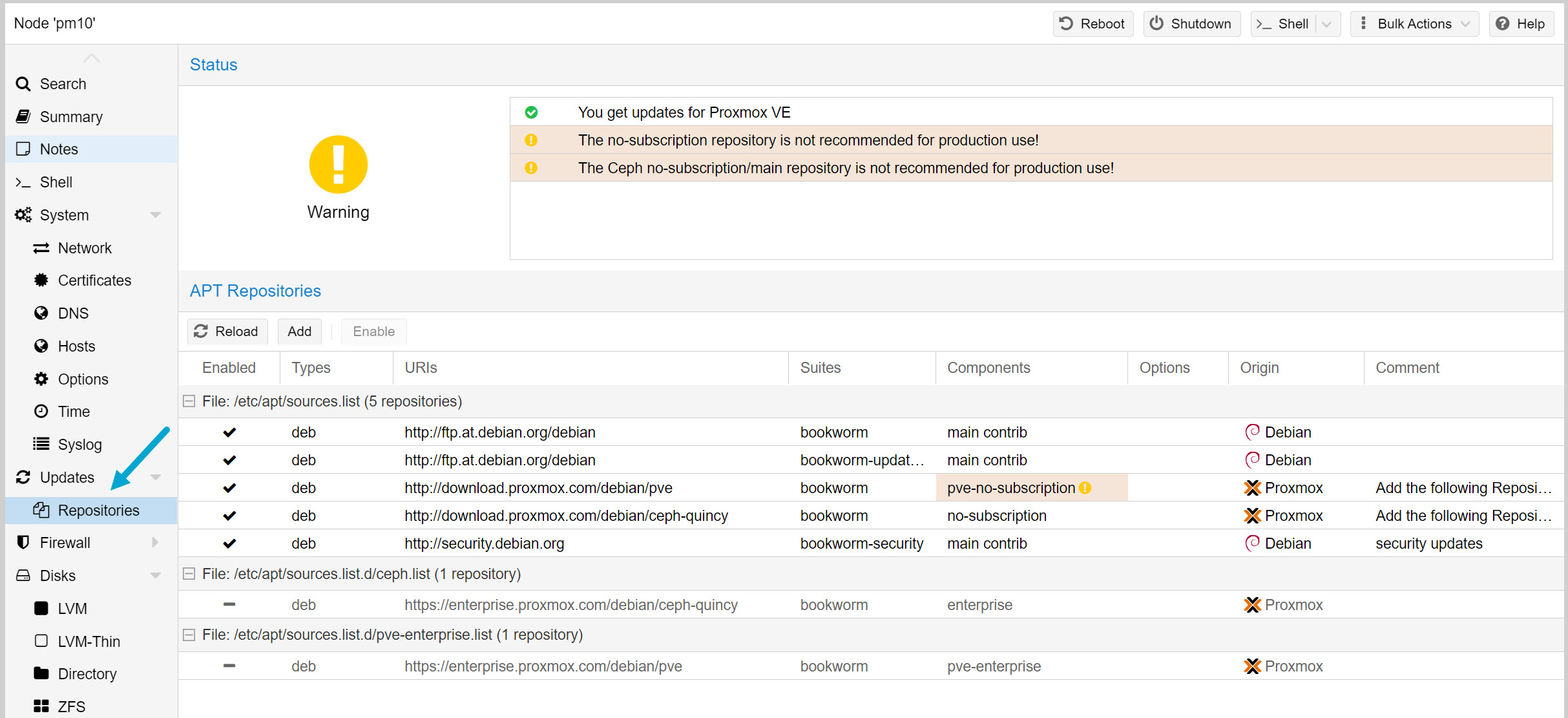 After the installation per default the Proxmox and Ceph enterprise repositories are enabled, which leads