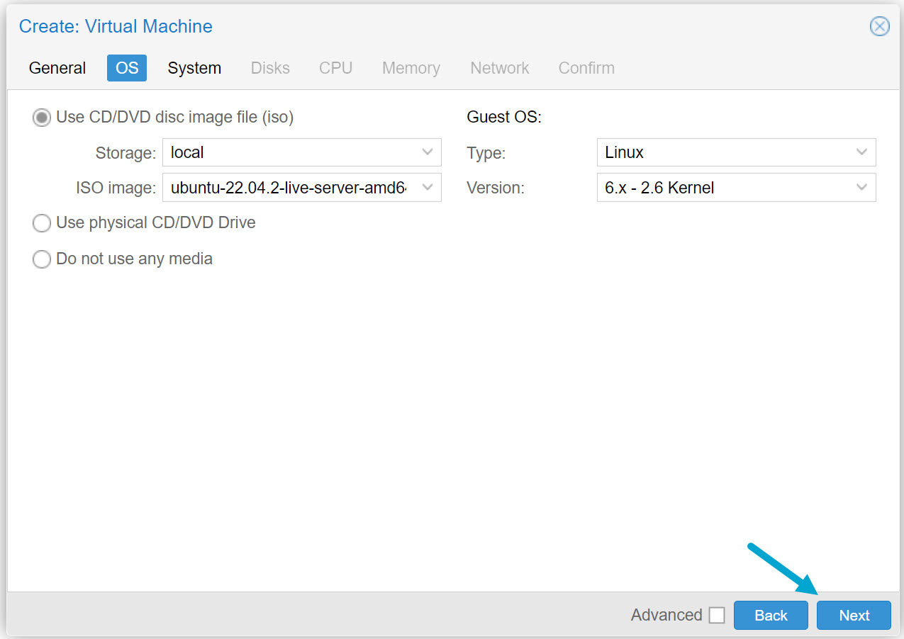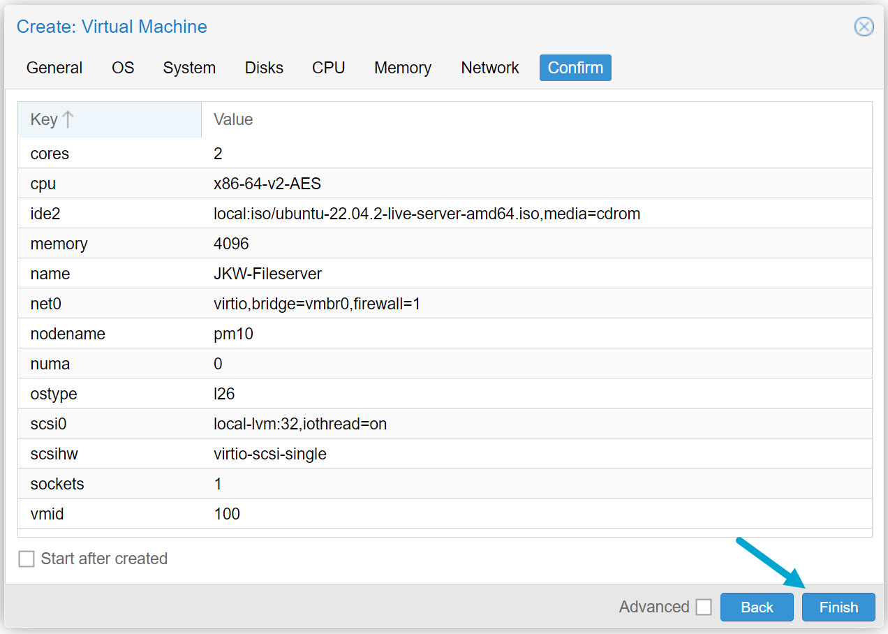 Select the node, in my case it’s “pm10” and define an ID for the VM. The minimum value for the ID is 100.