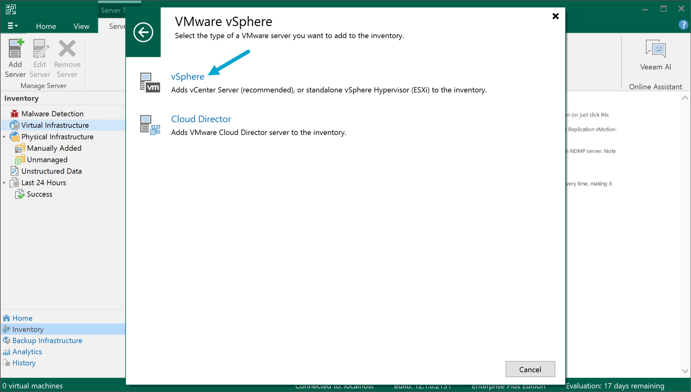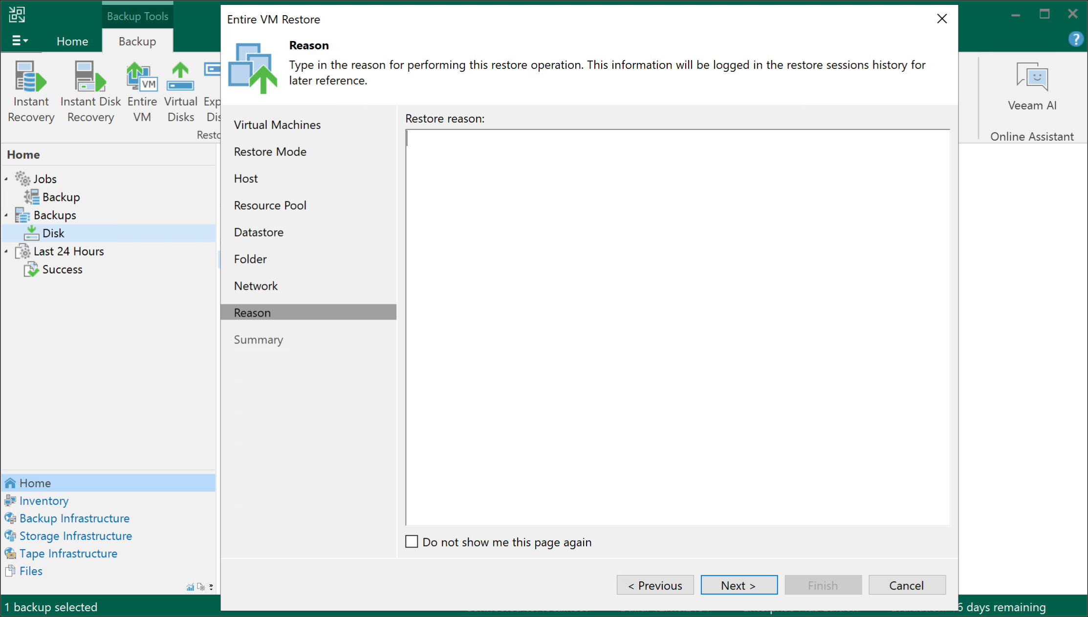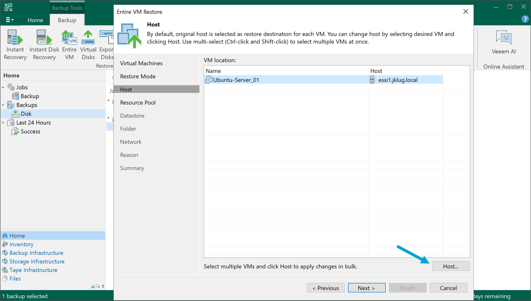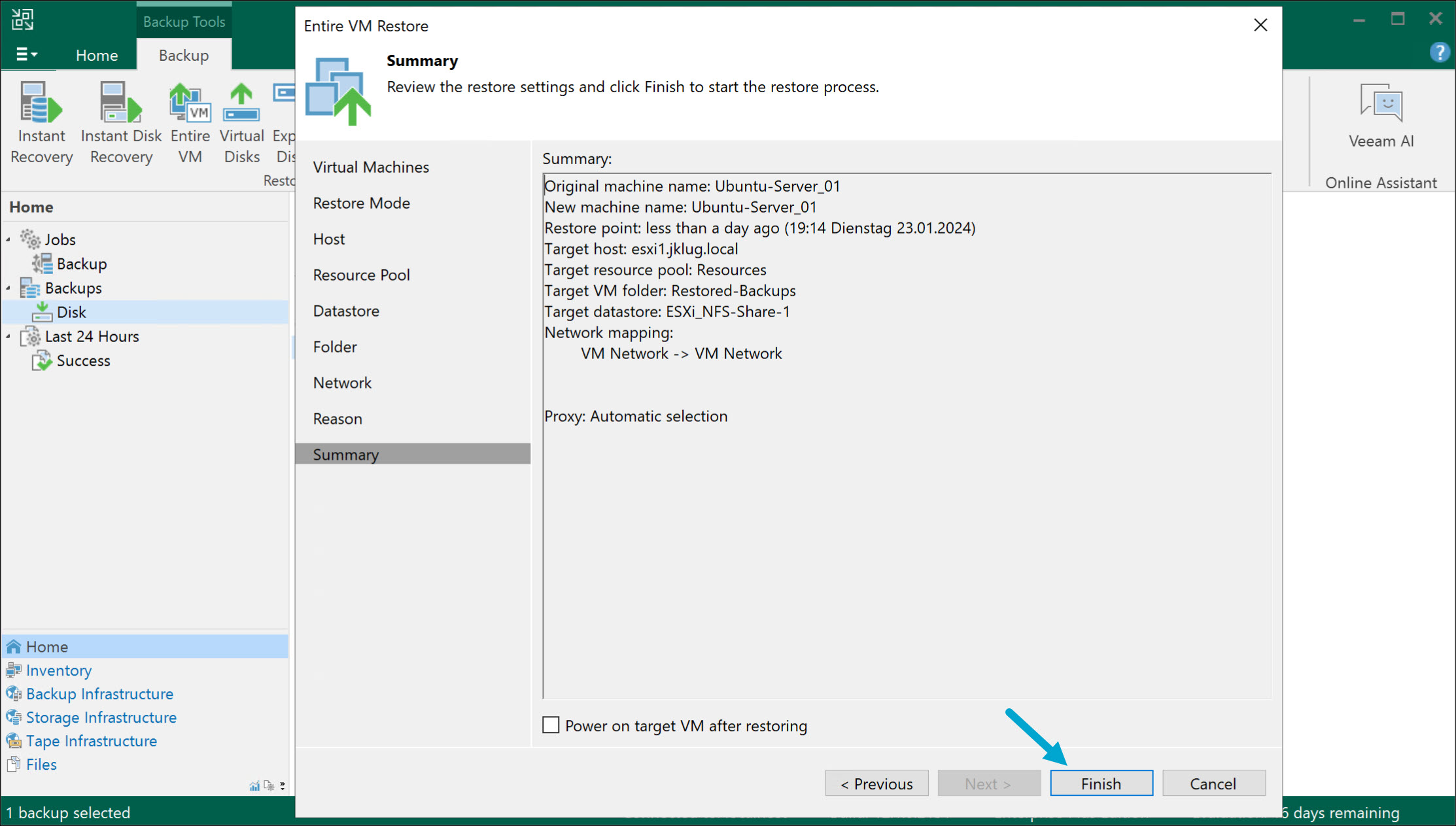 - Check out the restored backup on vSphere. Disconnect the network interface so that there is no IP conflict with the running original VM
