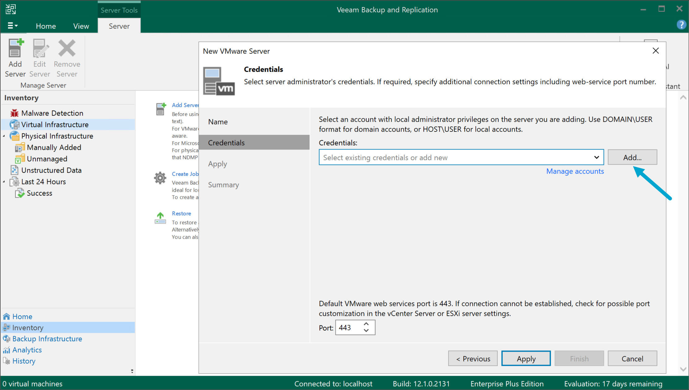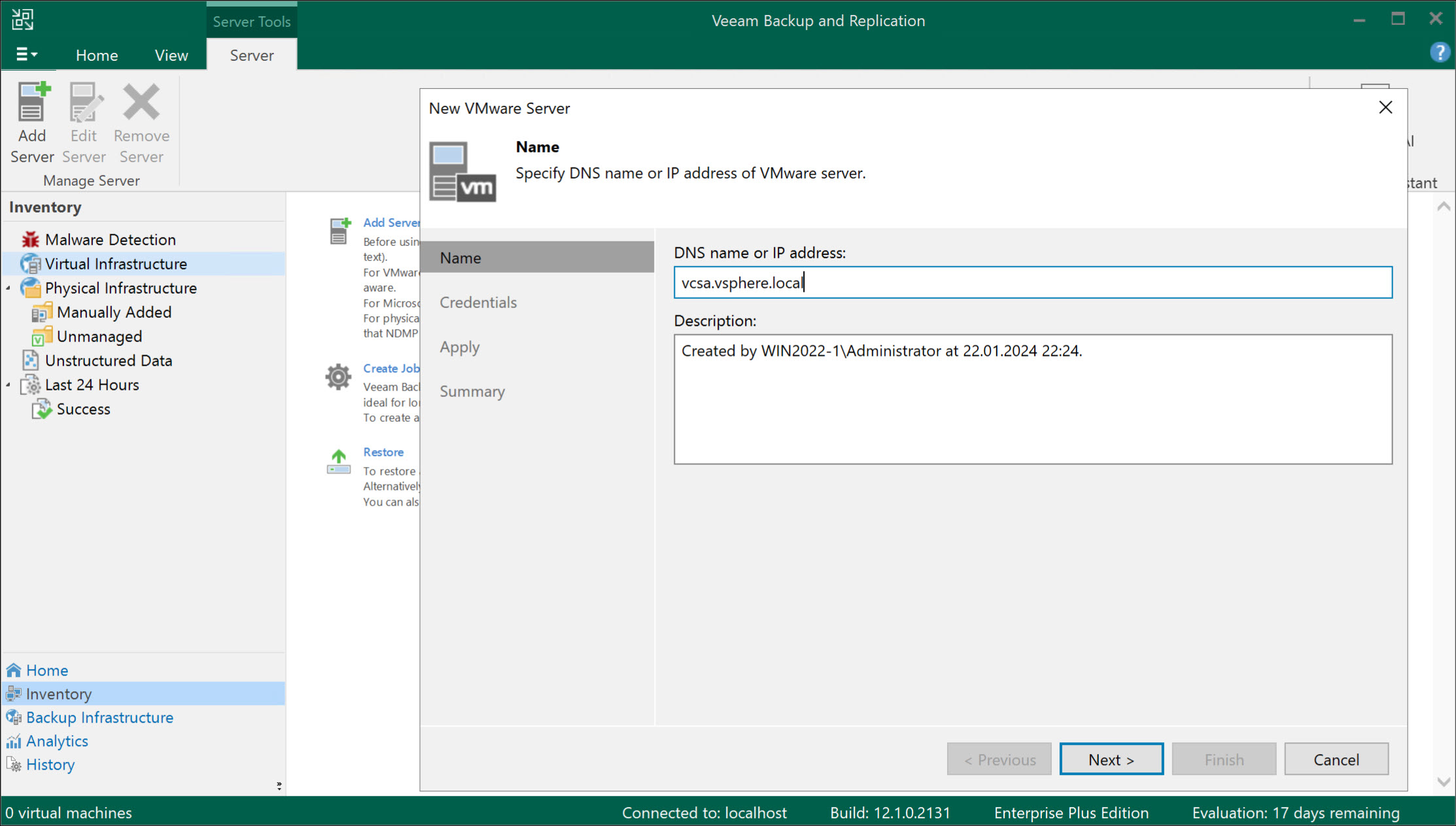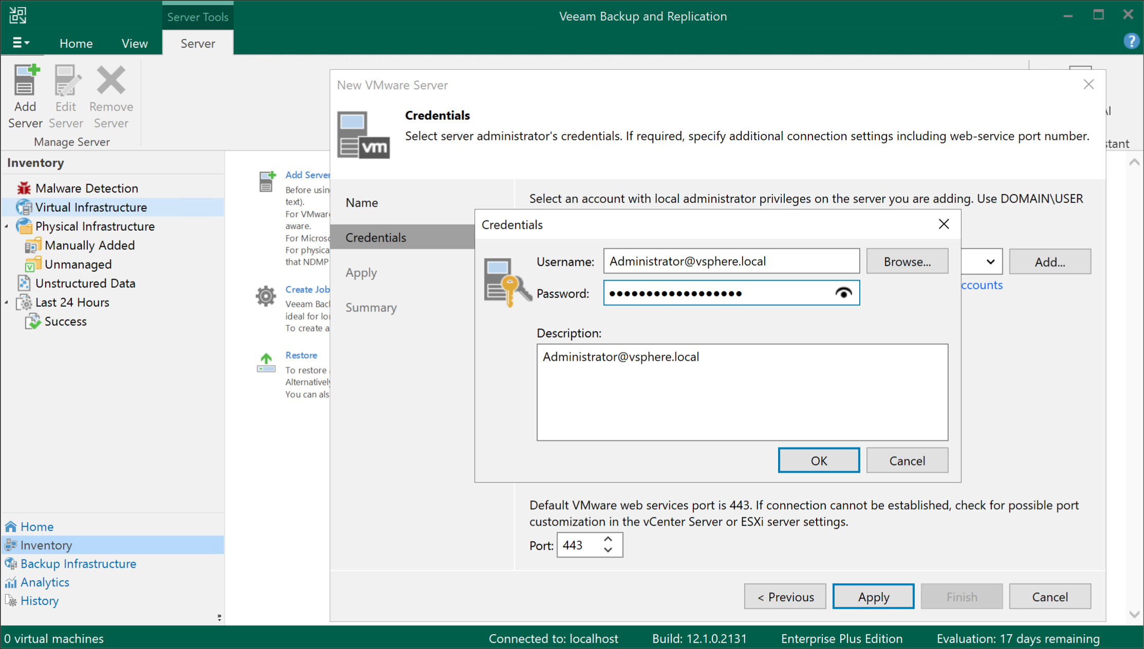 Note: In my homelab I used to main Administrator vSphere credentials. As best practice create specific vSphere credentials for Veeam only.